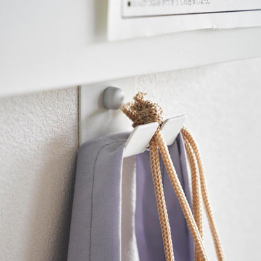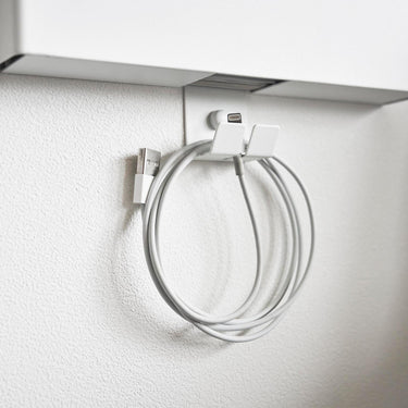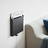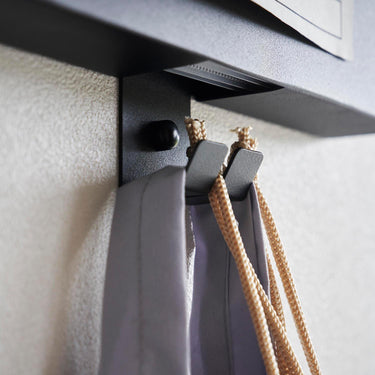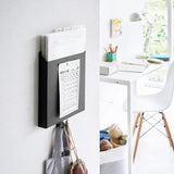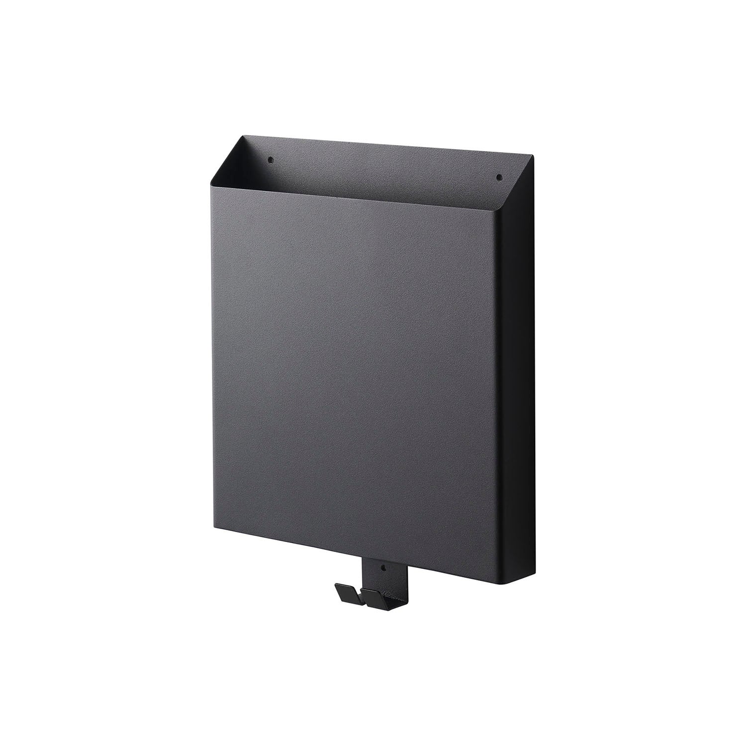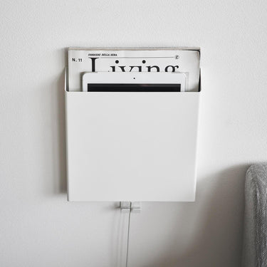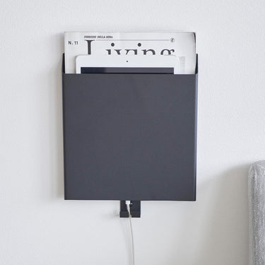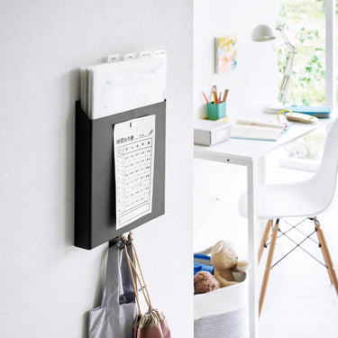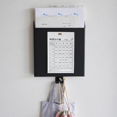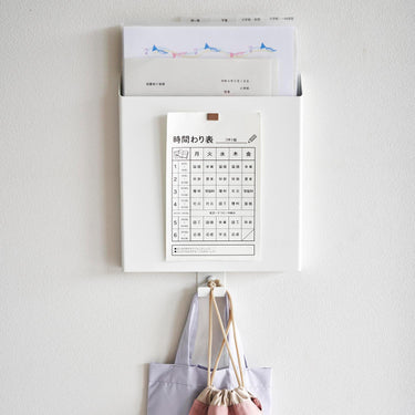 A print storage holder that can be attached to the wall with plasterboard pins. Ideal for organising the daily accumulation of prints, magazines, and more. Perfect for use in children's rooms or living rooms. Made of steel, it allows you to attach timetables and notes that you check daily with magnets. Comes with index stickers that are handy for sorting clear files and such. Equipped with hooks for storing bags and handbags. Also recommended as a fixed place for magazines and tablet PCs. You can charge your device while it's stored, by threading the charging cable through the gap at the bottom. When not in use, the charging cable can be stored on the hook.