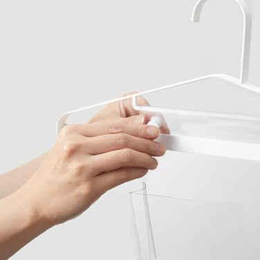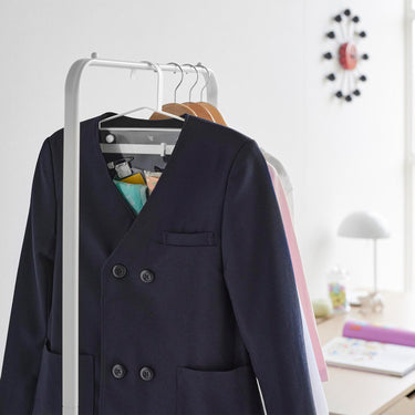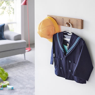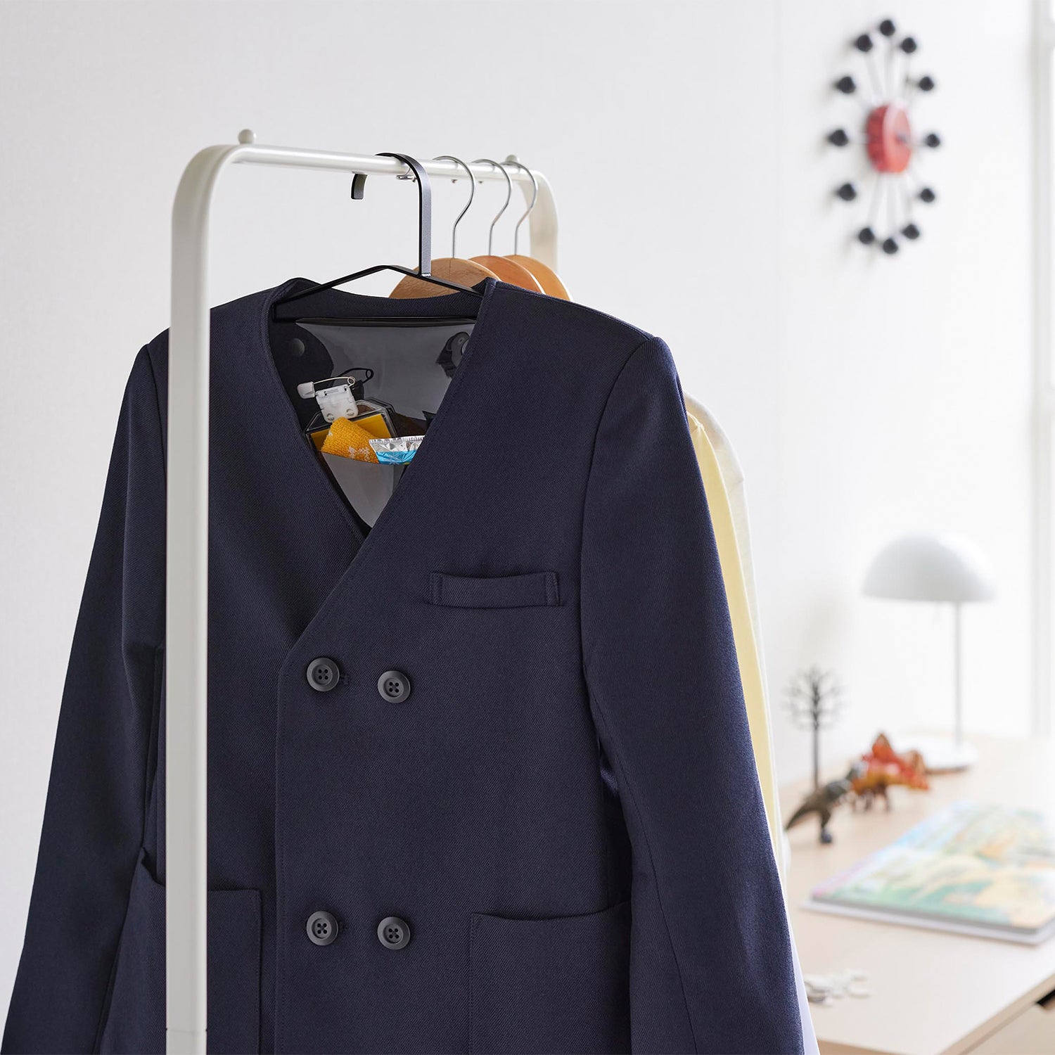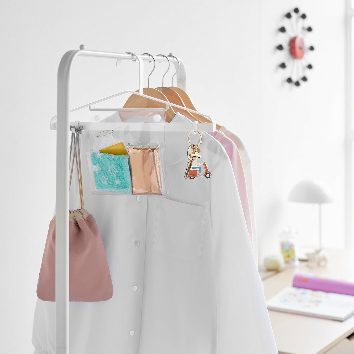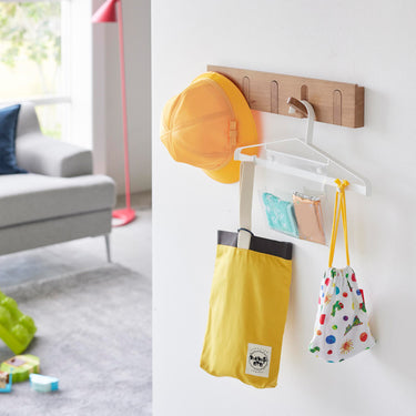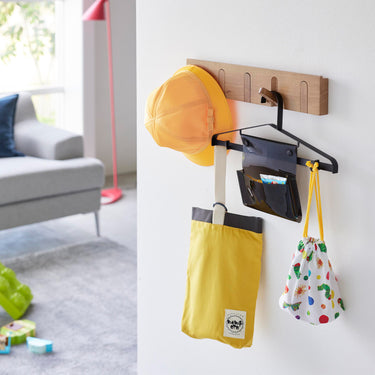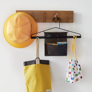Tidying up becomes preparation for the next day! This hanger, perfect for hanging coats or uniforms, now comes with transparent pockets and movable hooks. It's ideal for practicing 'preparation for tomorrow' as all items can be hung together. It can be used as your child grows. The transparent pockets can store tissues and handkerchiefs, while the movable hooks can hold key holders and personal alarms.