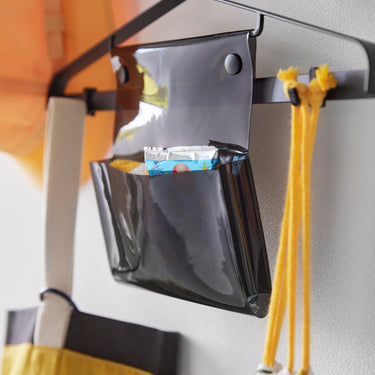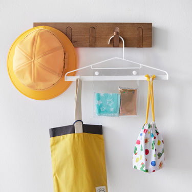 A hanger that conveniently holds all the essentials for school or outings.