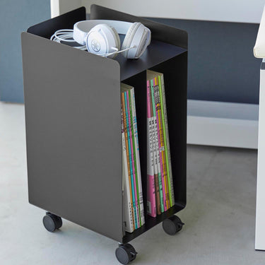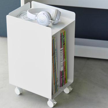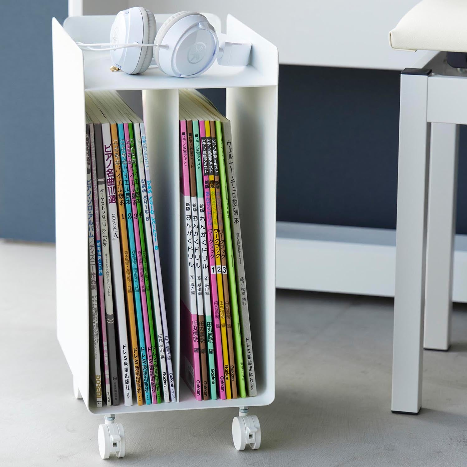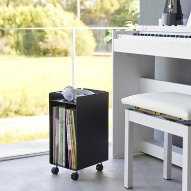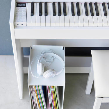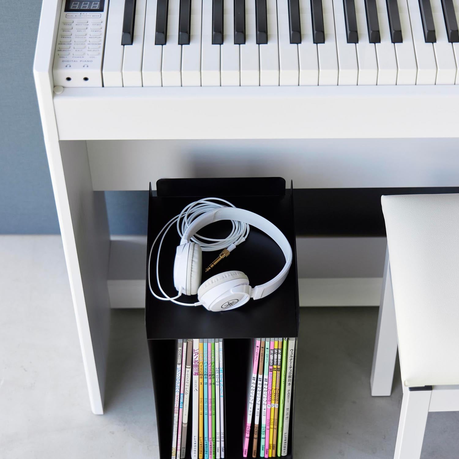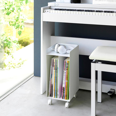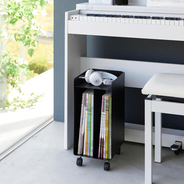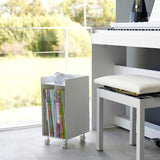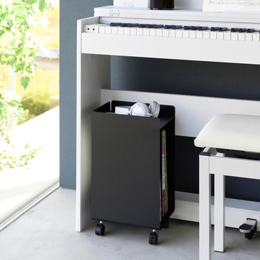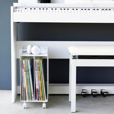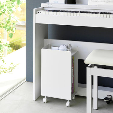 A compact mini wagon with casters, perfect for neatly storing your piano sheet music at your feet. With its casters, moving it around is a breeze. It's compact size allows for storage without taking up much space. The top surface can be used to place small items such as headphones.