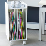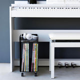 A mini wagon with casters that allows you to neatly store your piano sheet music at your feet.