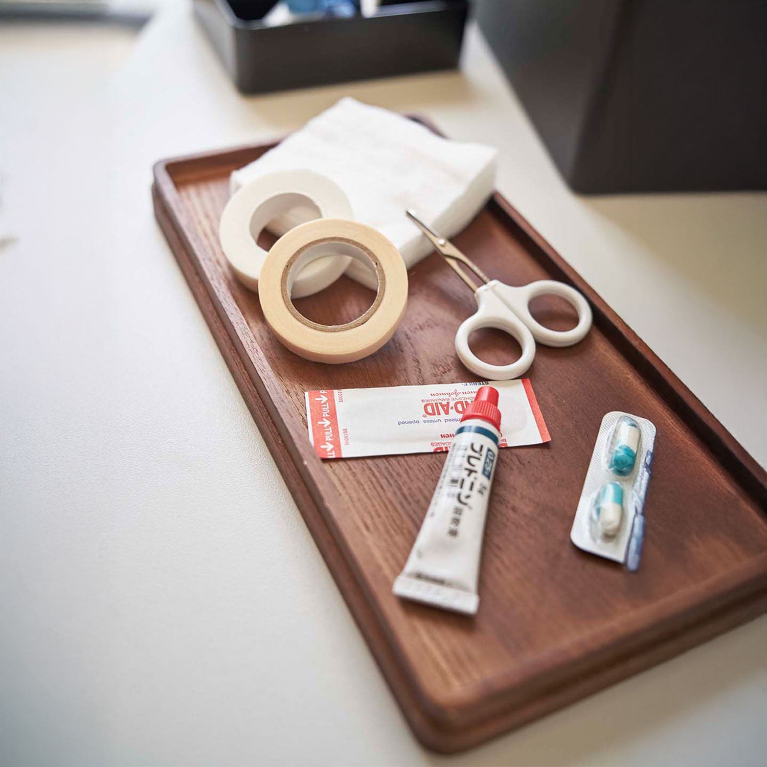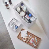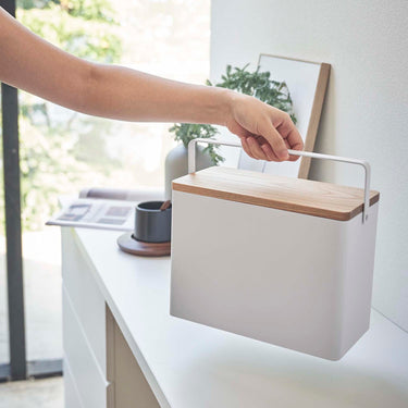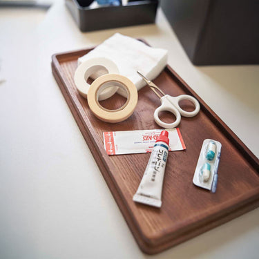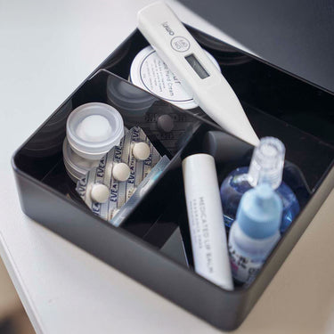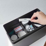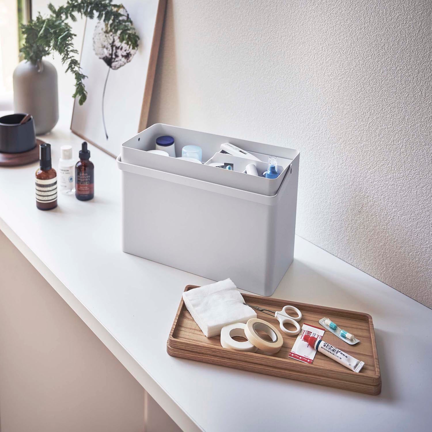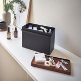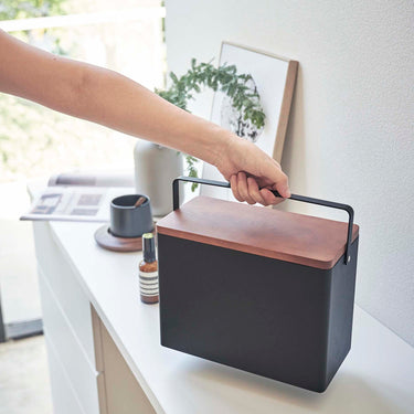 Just right for everyday living. The top tray is a sliding type and can be stored in either vertical or horizontal orientation. Comes with a convenient handle for easy carrying. The tray can be removed, allowing you to temporarily place your tools on the table without scattering them. Its design doesn't betray its practicality, even when left out. It's tall enough to store bottles of disinfectant. Flip the wooden lid over and it can also be used as a tray.