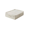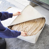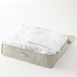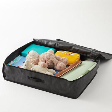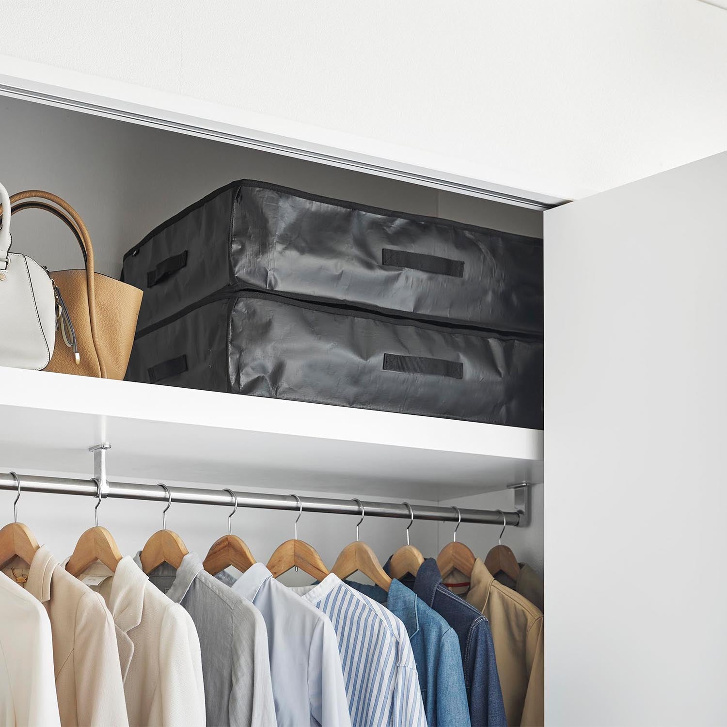 A sturdy storage case made from durable, dirt-resistant polyethylene sheeting. Store your frequently used items to keep your living room tidy. With handles on both the front and side, you can place it in any direction. The double zip that runs around all four sides allows you to open and close it wherever you prefer. It can be stored upright in the gaps in your closet and is stackable. Ideal for storing clothes that are out of season or no longer fit, as well as seasonal bedding such as blankets and quilts. It's also great for storing toys and school supplies that aren't used daily. The polyethylene sheeting has a matte texture and is durable, water-resistant, easy to care for, and suitable for both indoor and outdoor use.