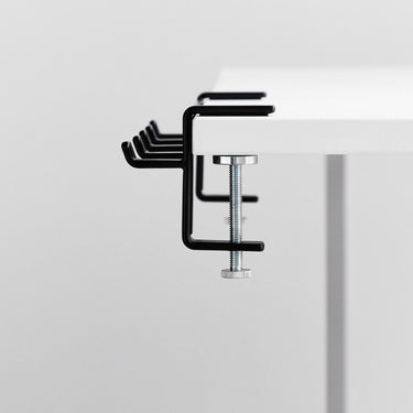 A sturdy steel 5-hook rack that attaches to your desk without drilling, using adjustable screws.