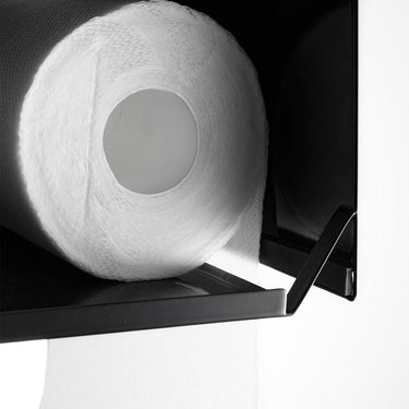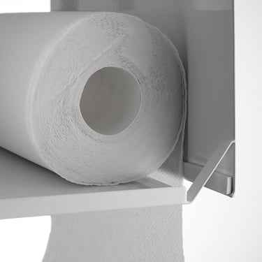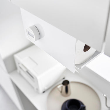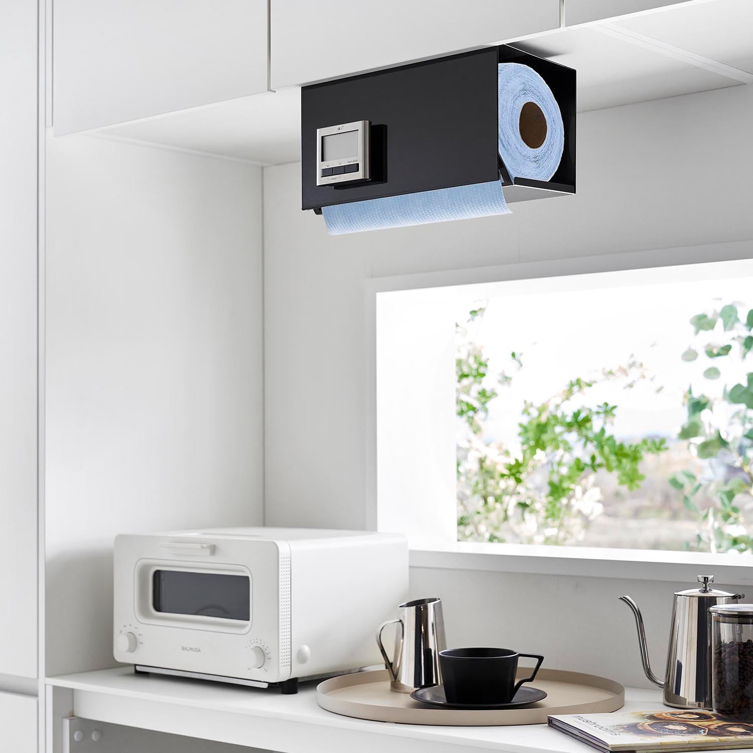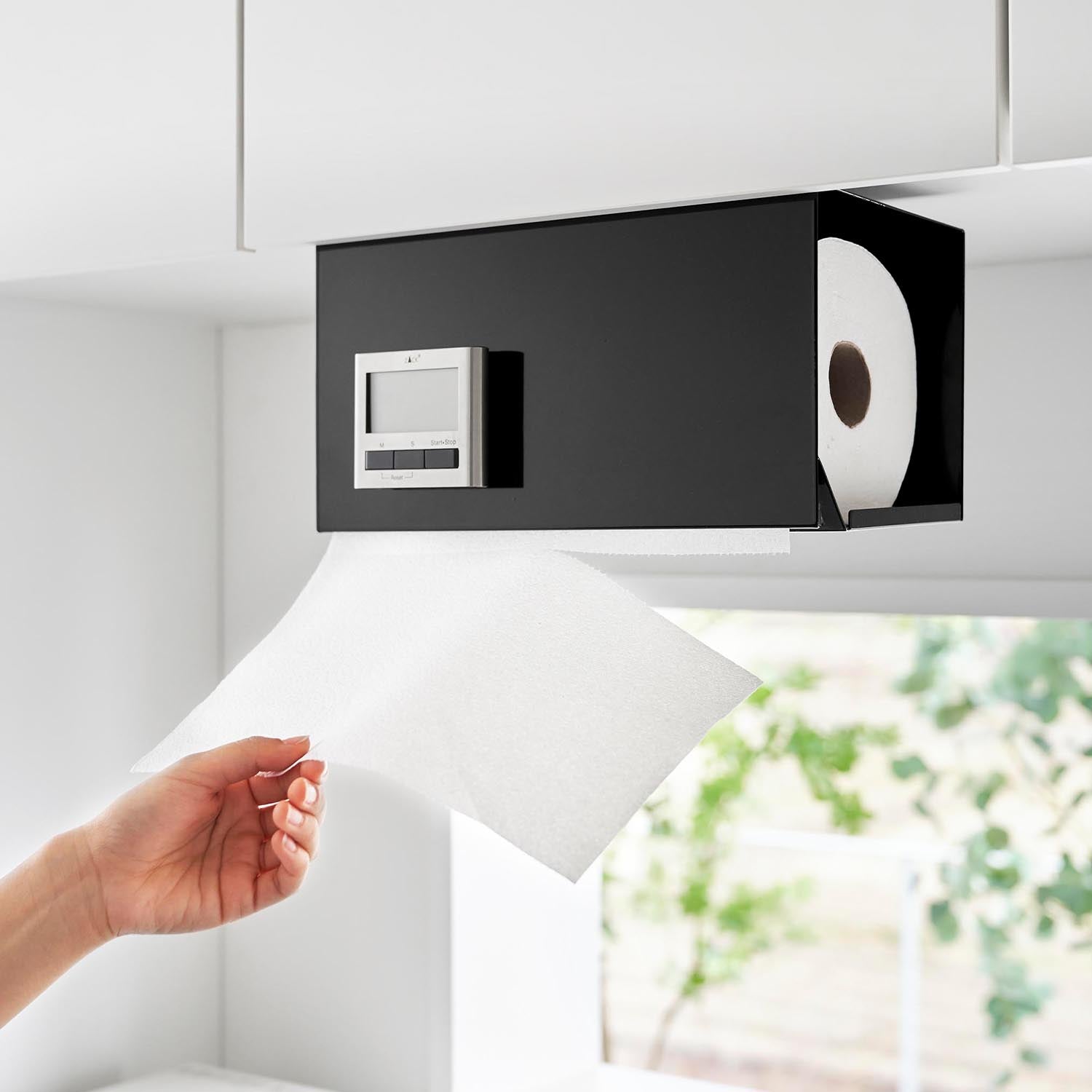 This is a covered kitchen paper holder that fits under the cupboard and is compatible with large format kitchen paper. It can be stored floating under the cupboard, and the cover prevents dust and oil splashes, keeping it hygienic. Made of durable steel, you can attach magnets and the like. It has a silicone stopper, so you can easily cut with one hand. You can easily replace it by simply inserting it from either the left or right. It can be securely fixed under the cupboard with an adjustment screw.