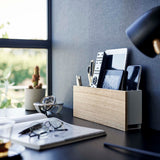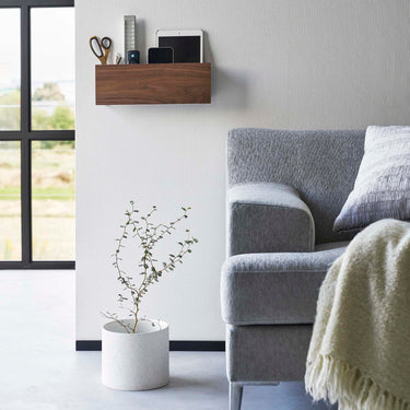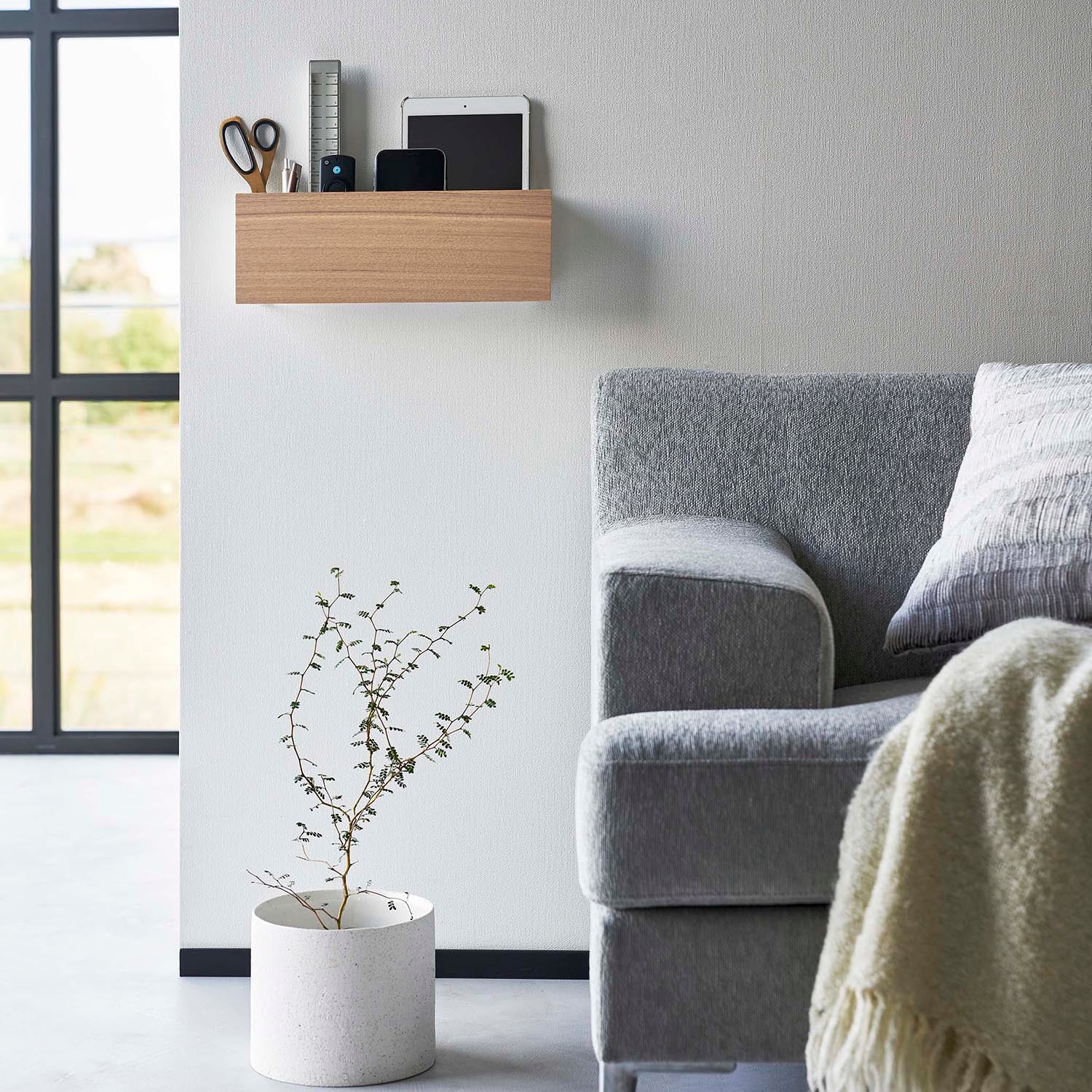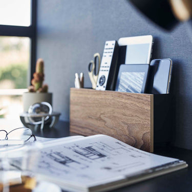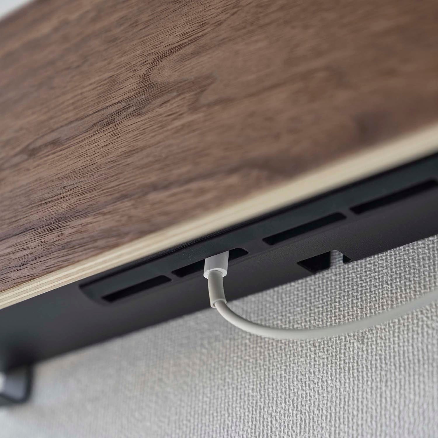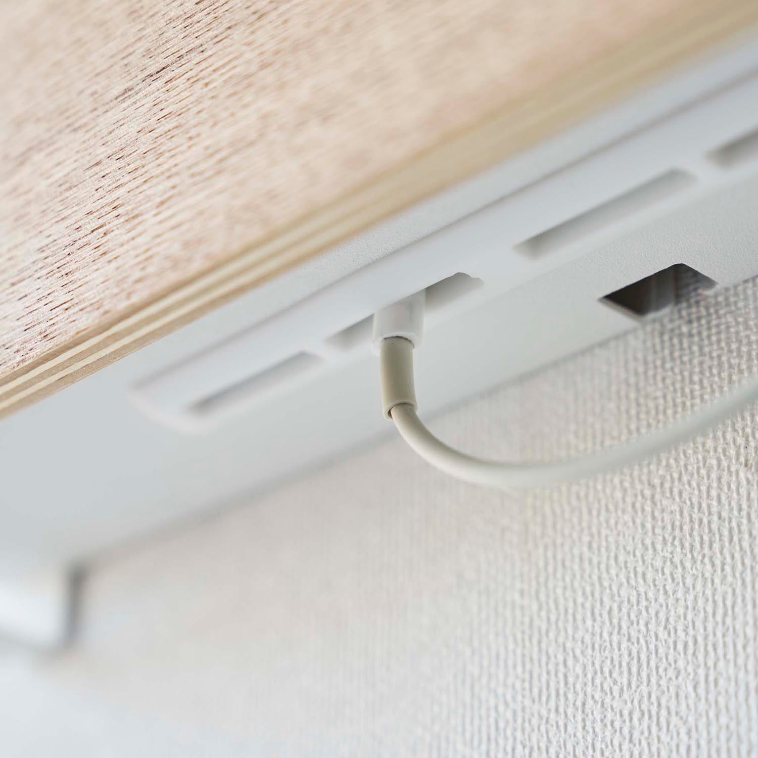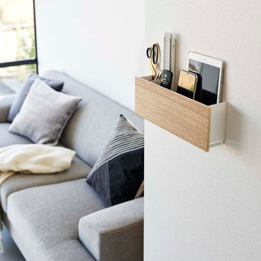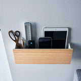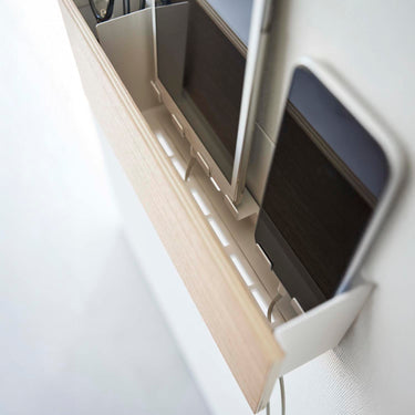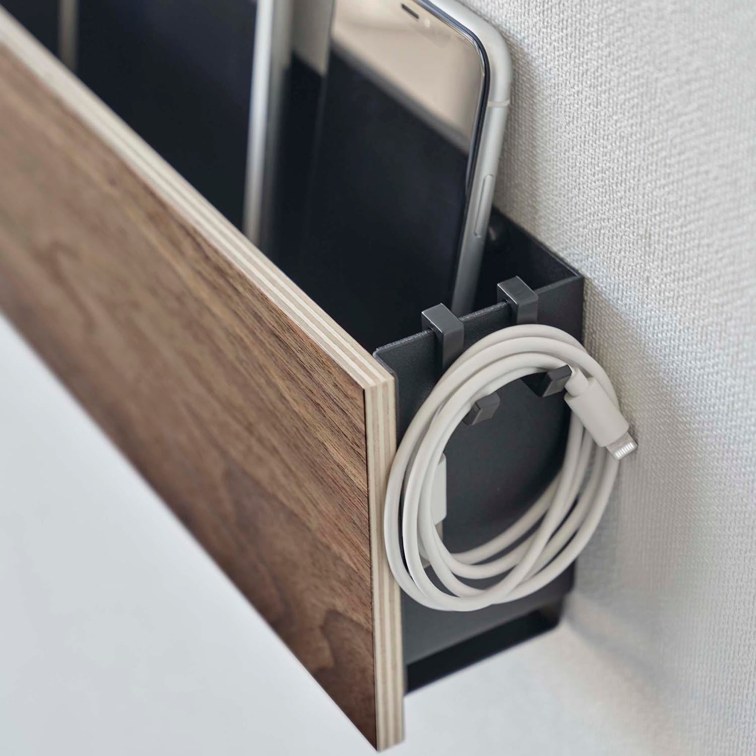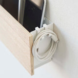 A storage holder that can be attached to the wall with plasterboard pins. It's convenient for storing items out of reach of children and pets. Once you decide on a fixed position for storage, your room will be neatly organised. You can charge your devices while they're stored, thanks to the slot at the bottom for passing through charging cables. By threading cables through the bottom frame, your wiring will be neatly arranged. The included charging hanger makes attaching and detaching cables smooth. The included hooks allow you to neatly store cords. It can also be used freestanding. It's convenient to attach it somewhere within easy reach, like next to the sofa.