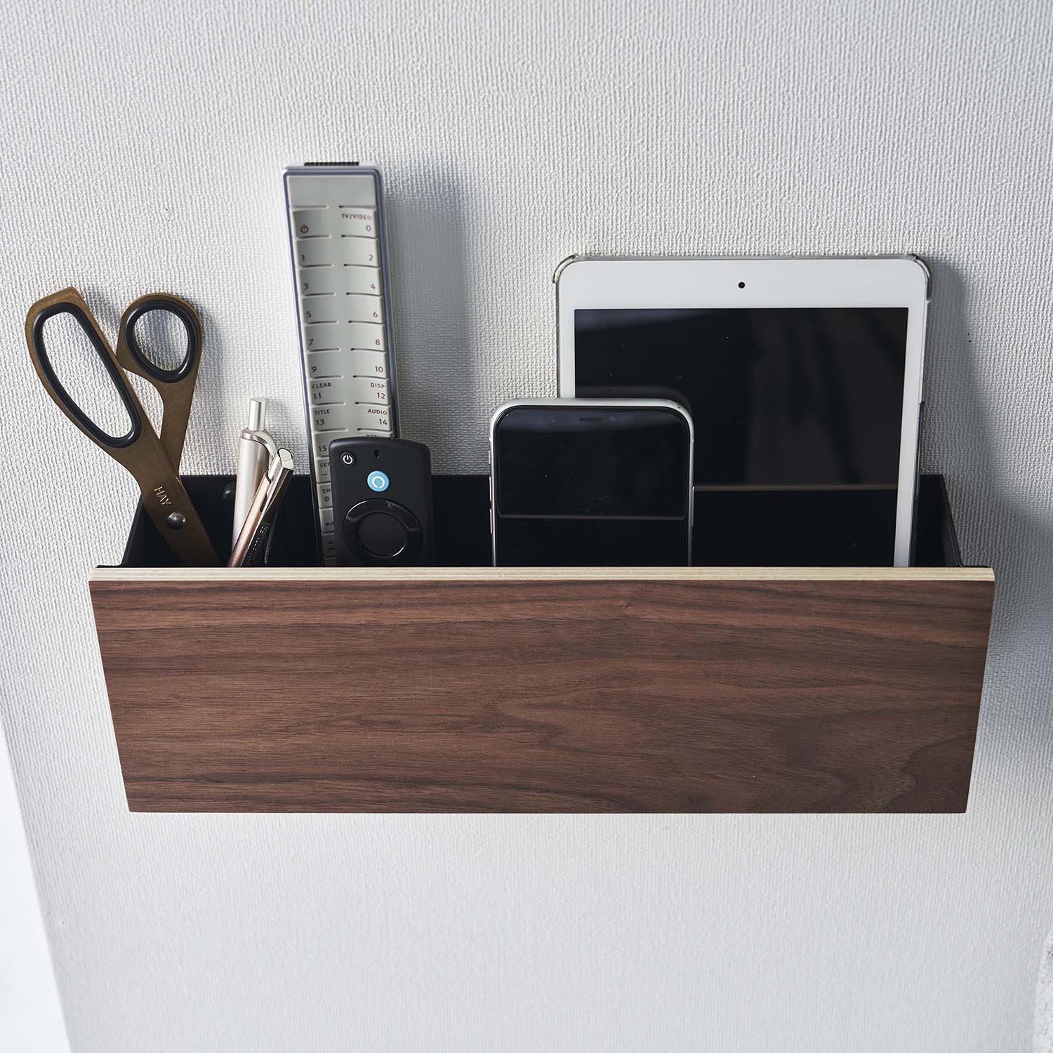 Effortlessly suspend items such as remote controls, tablets, pens, and scissors on the wall for neat and tidy storage.