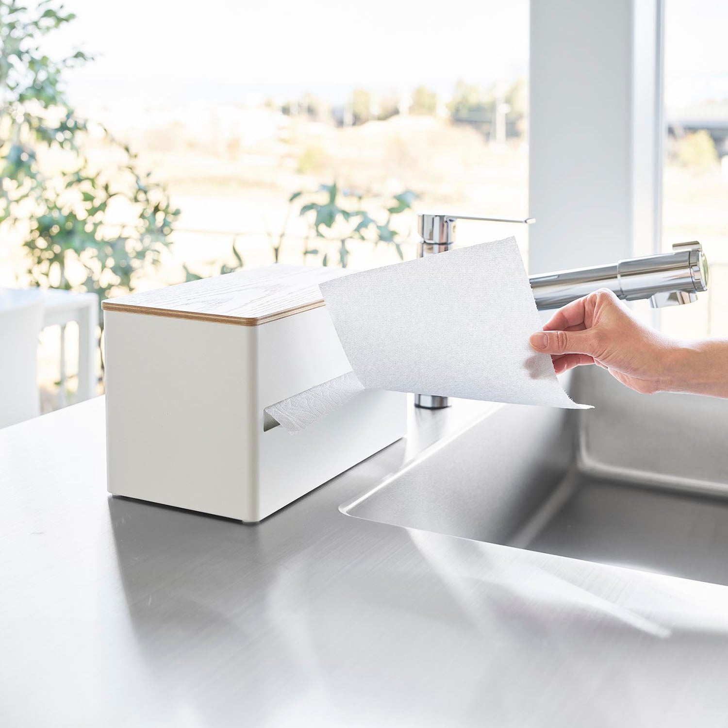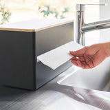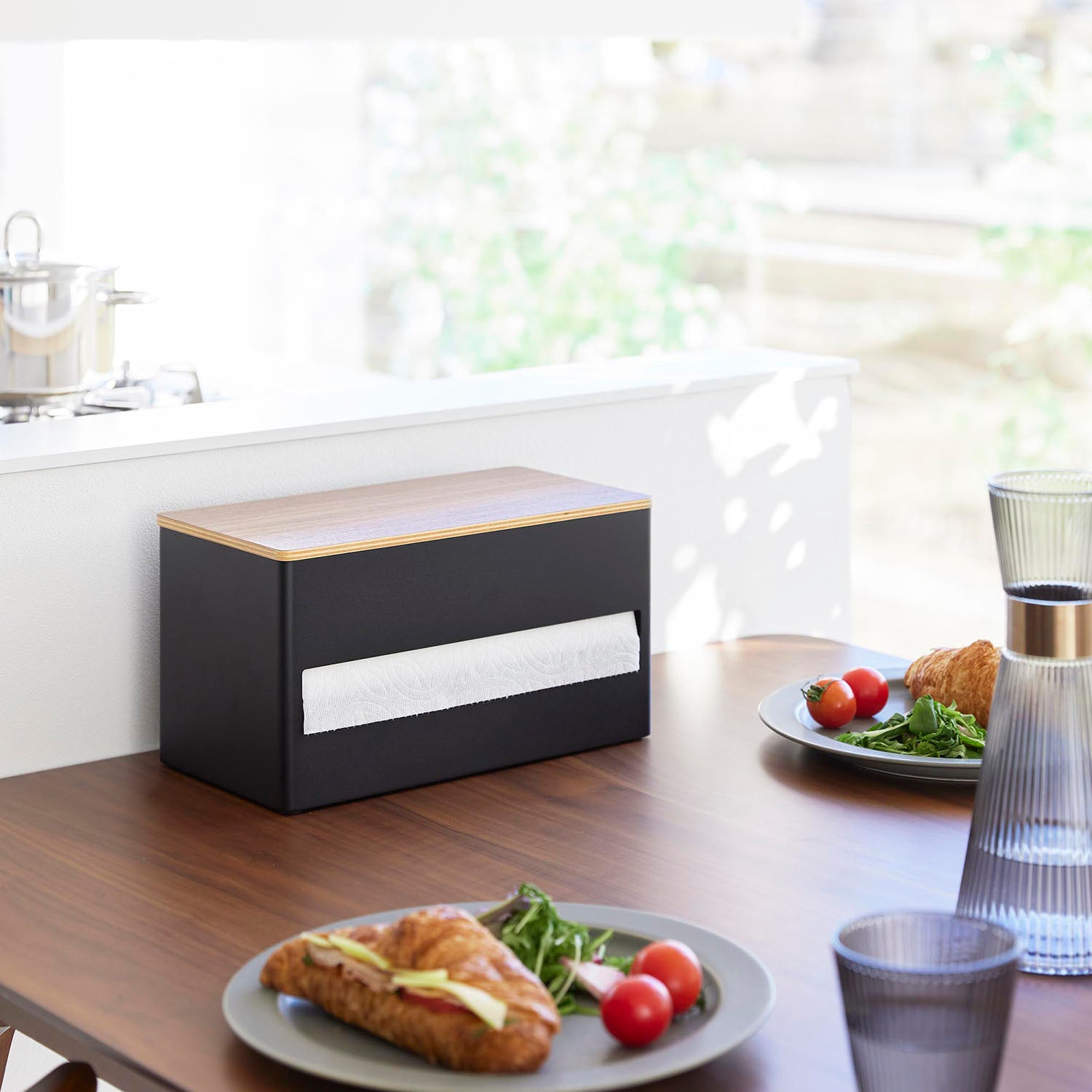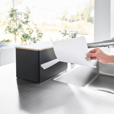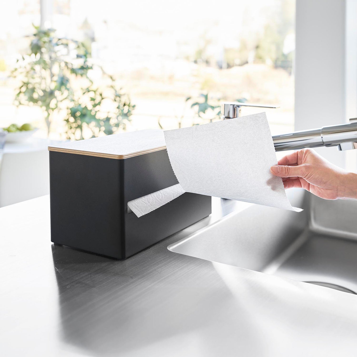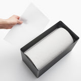 This kitchen paper holder is convenient for one-handed cutting. It features a shaft for smooth rotation and a silicone stopper at the outlet for easy cutting. It's designed to discreetly store your kitchen paper, making it a neat addition to your kitchen, dining area or washroom. It's also compatible with foreign-made kitchen paper. The elegant design combines wood and steel, with the sturdy and heavy steel construction providing stability.