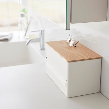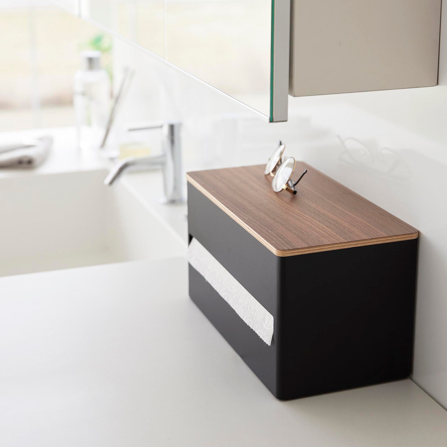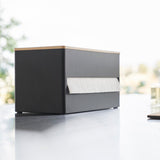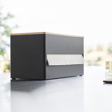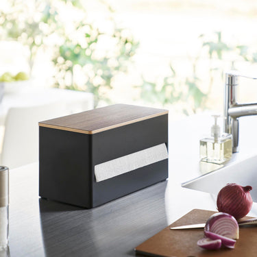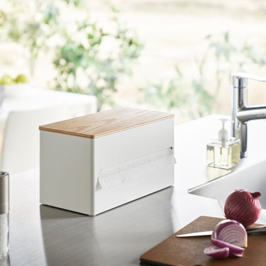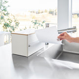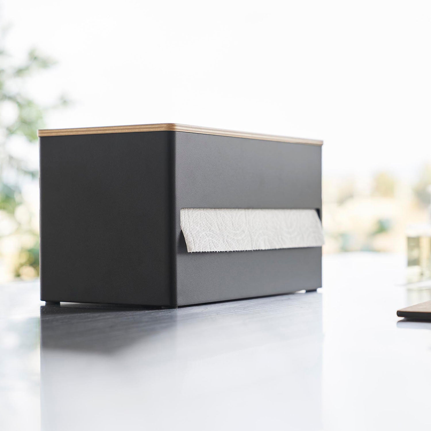 This kitchen paper holder is convenient for one-handed cutting. It features a shaft for smooth rotation and a silicone stopper at the outlet for easy cutting. It's designed to discreetly store your kitchen paper, making it a neat addition to your kitchen, dining area or washroom. It's also compatible with foreign-made kitchen paper. The elegant design combines wood and steel, with the sturdy and heavy steel construction providing stability.