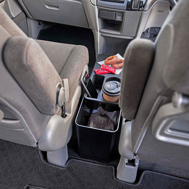 The lid slides open, allowing for easy disposal from the back seats as well.