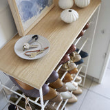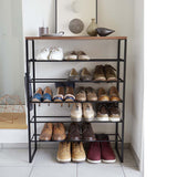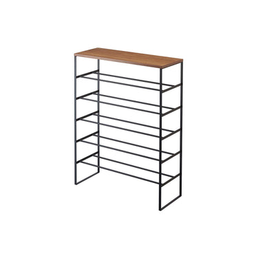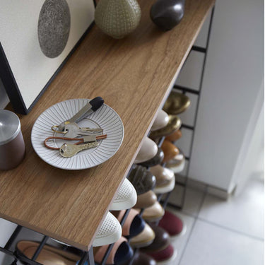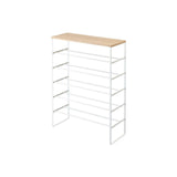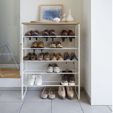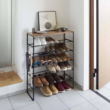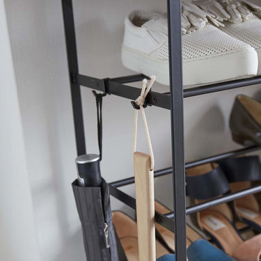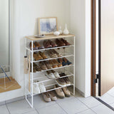 A six-tier shoe rack with a top shelf that can neatly store shoes overflowing from your shoe cabinet. If placed in the entrance, it can hold approximately 18 pairs of men's shoes or 21 pairs of women's heels. It comes with hooks, allowing you to conveniently store small items such as shoe horns or foldable umbrellas.