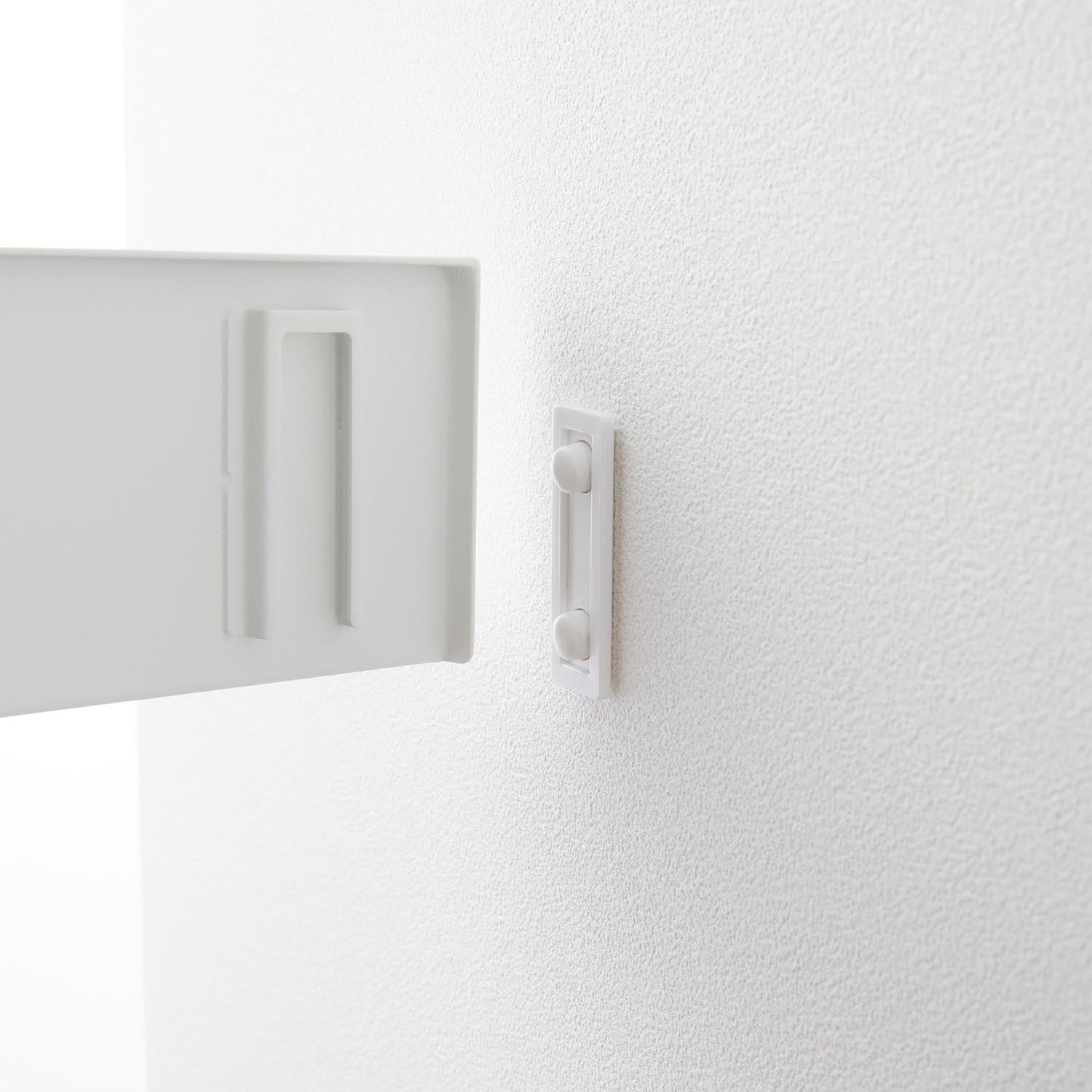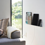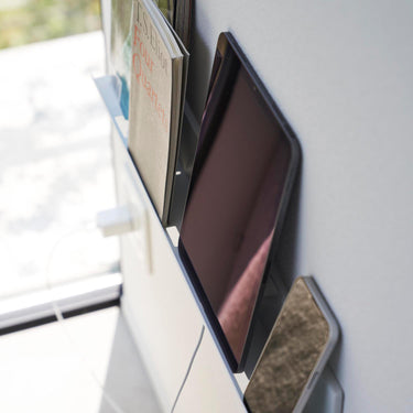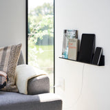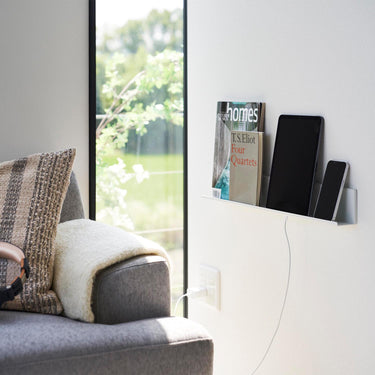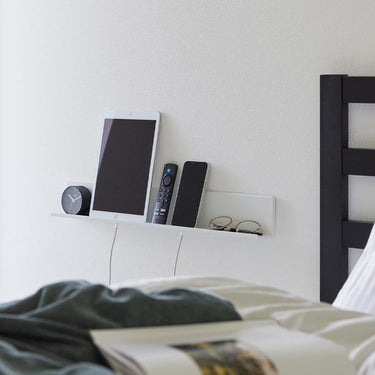 With a simple design that suits any location, this shelf can be stylishly installed on the walls of your living room or bedroom. It's not just for tablet PCs, it's also handy for storing remote controls, clocks, and glasses. You can even store learning tablets while they're charging. When not charging, you can hook the end of the charging cable for storage. Installation is as simple as attaching the base and slotting it in. The plasterboard pins make the holes in the wall less noticeable. It can also be installed with wood screws.