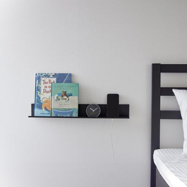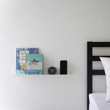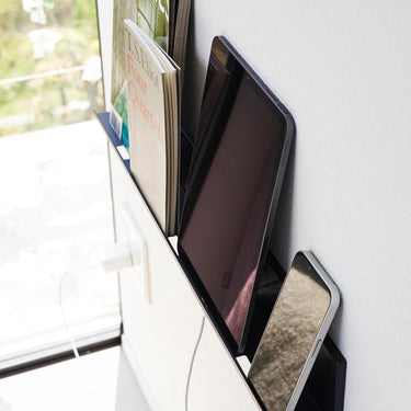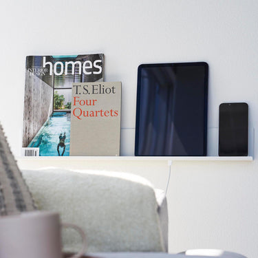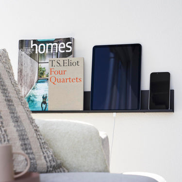 A slim shelf that allows you to store tablets or books suspended from the wall using plasterboard pins.
