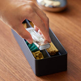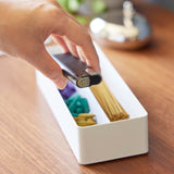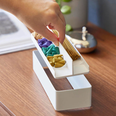 The incense holder can be attached to the lid with a magnet for storage. The lid can be hung on the body. The storage tray comes with dividers, allowing you to store by scent or type. The divided storage tray can be removed and washed thoroughly. It can also be used with cone-type incense. *Please note that a cone-type incense holder is not included.
