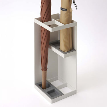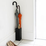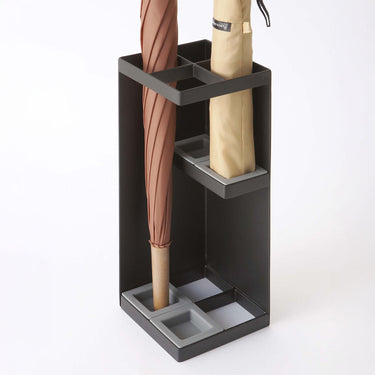 A compact, angular umbrella stand that fits perfectly into the corner of your entranceway. Its space-saving design ensures it won't take up too much room. The tray's position can be adjusted to accommodate folding umbrellas as well.