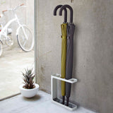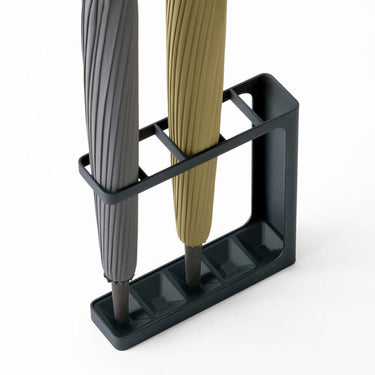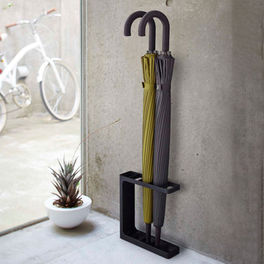 A slim umbrella stand that can hold up to five umbrellas. Its modern design is stylish.