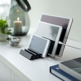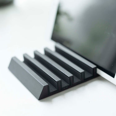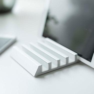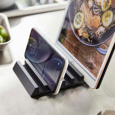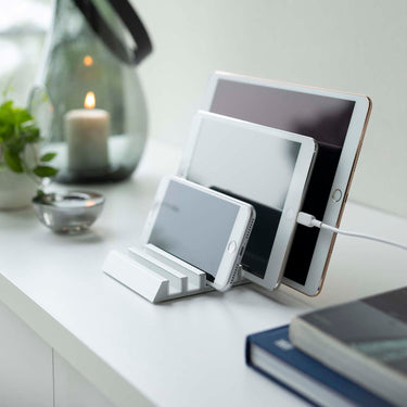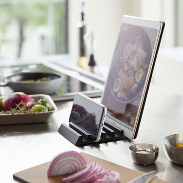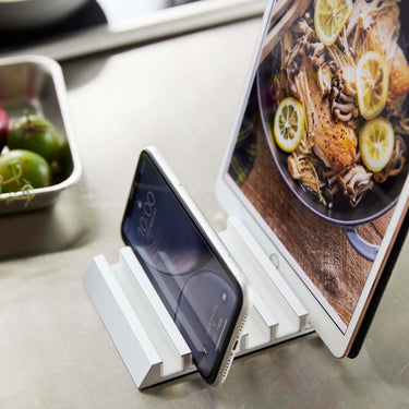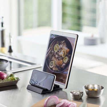Constructed from aluminium, this stand is both durable and stylish. The contact surface is equipped with silicone to prevent scratches. It's perfect as a recipe stand for your tablet, and even allows for charging while stored. The silicone ensures your devices won't get scratched.