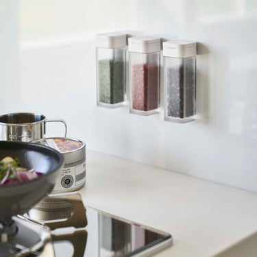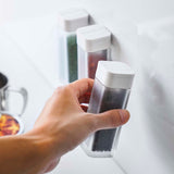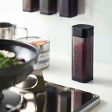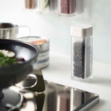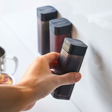 A spice bottle that can be neatly stored on any magnetic surface. Easy to grab from the wall during cooking. The lid is a slide type that can be opened and closed with one hand. It has two dispensing holes, allowing you to choose the right one for the size of your seasoning.