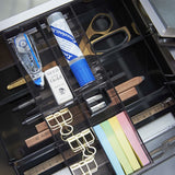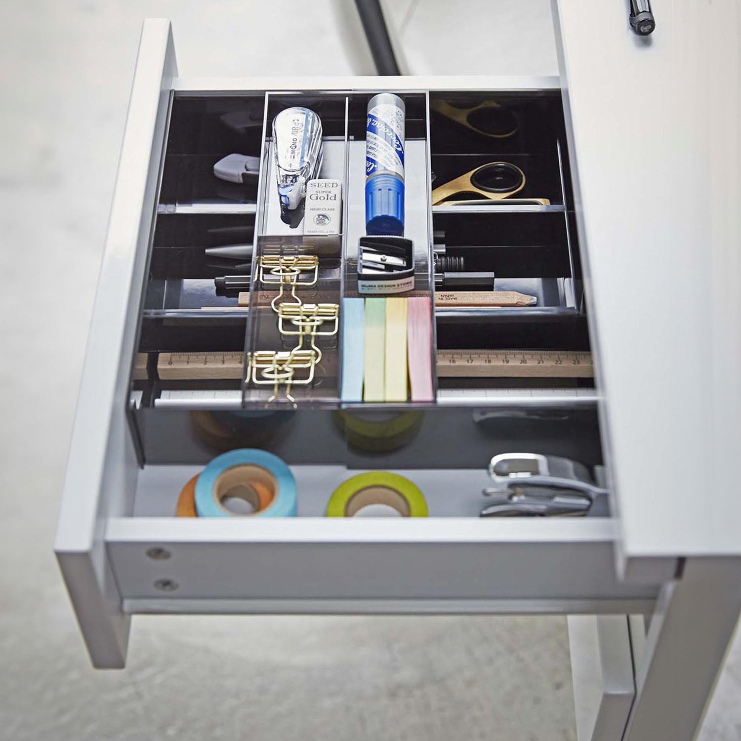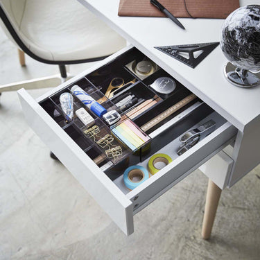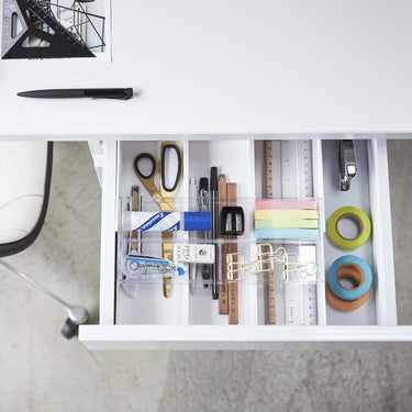 This desk tray perfectly fits your drawer size thanks to its expandable feature! The sliding top tray allows you to organise small items such as erasers, clips, and glue sticks separately. The expandable bottom tray is not only for pens and scissors, but also accommodates long stationery items like rulers.