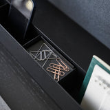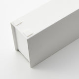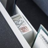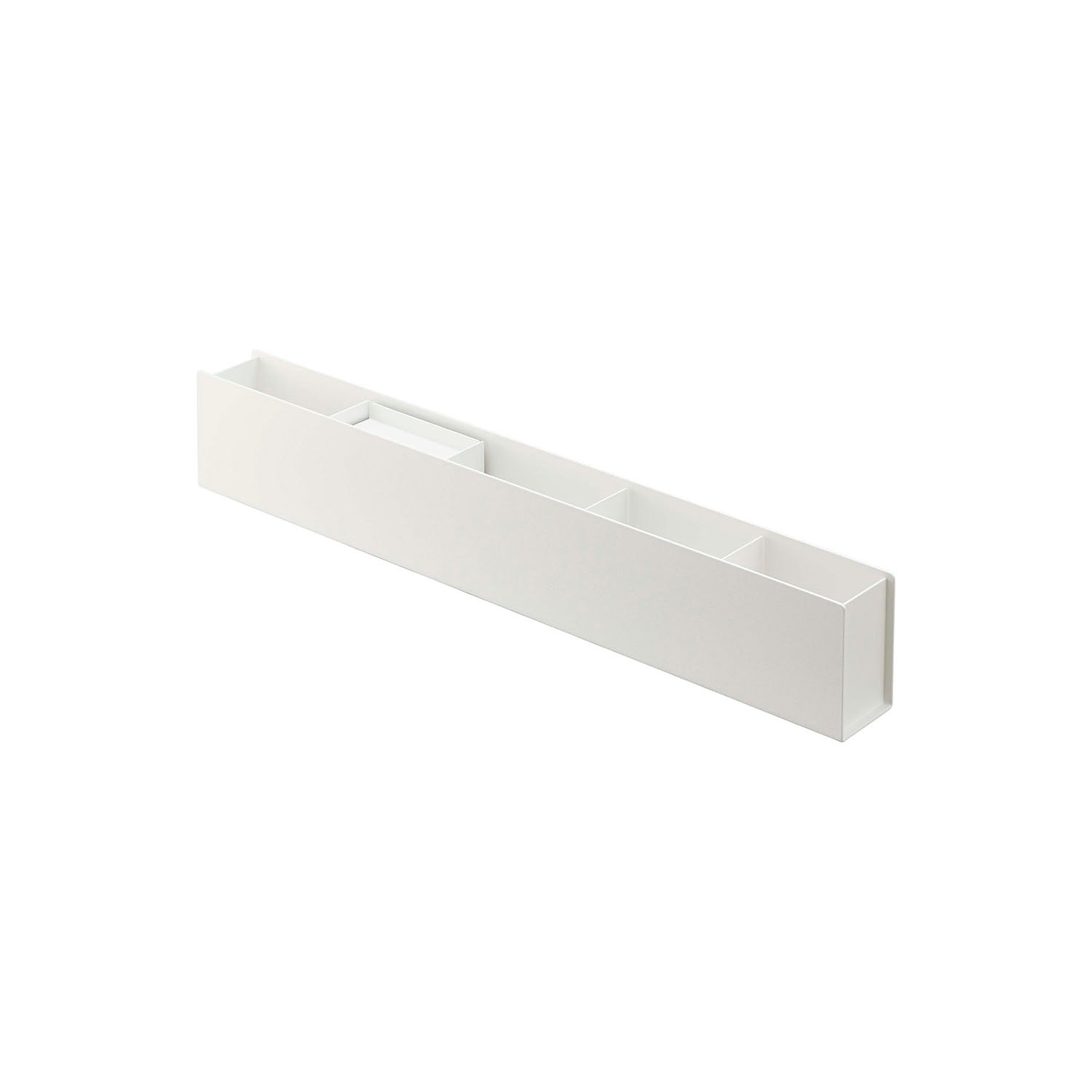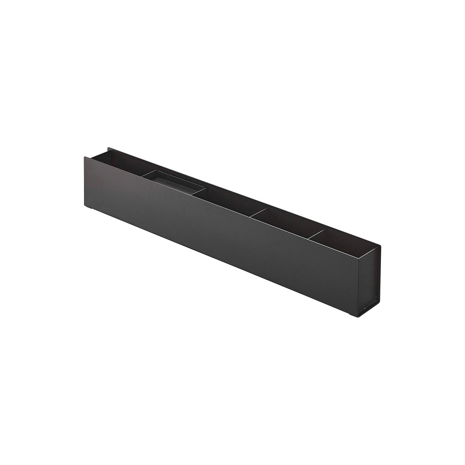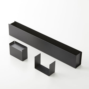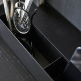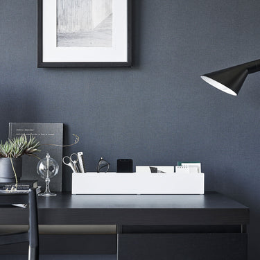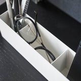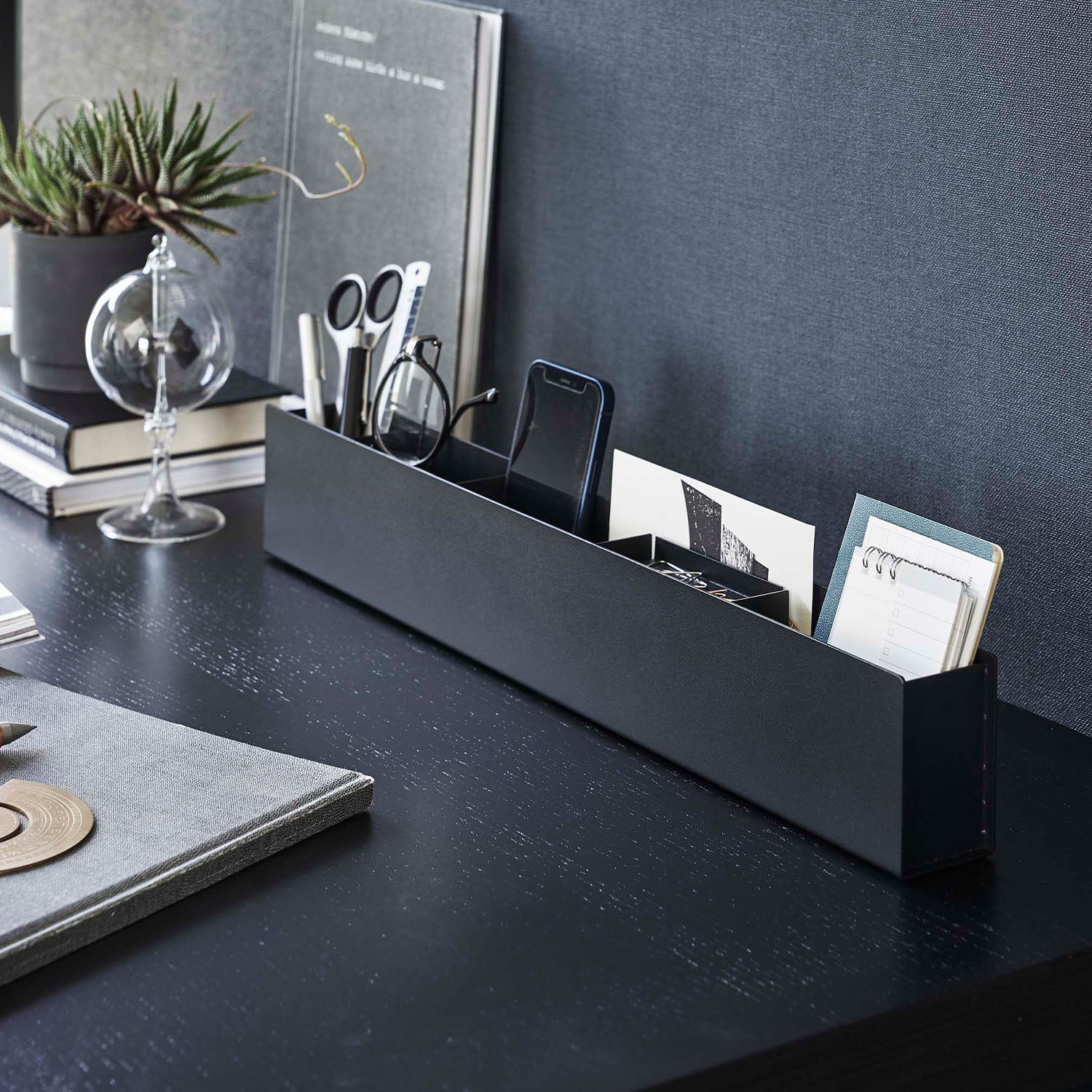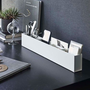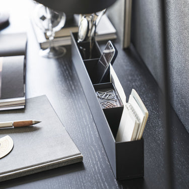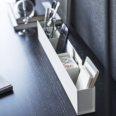 A slim desk organiser that doesn't take up much space. The base is lined with a silicone mat to prevent stored items from slipping. It includes a handy tray for storing small items such as clips. There's a slot for storing items like DMs. The U-shaped divider can be slid and arranged to suit the items you're storing.