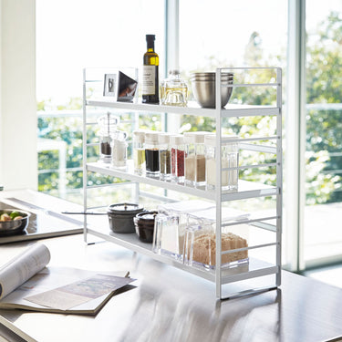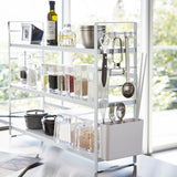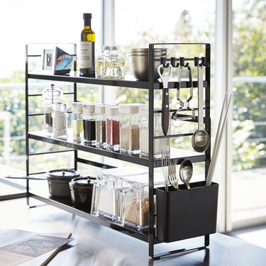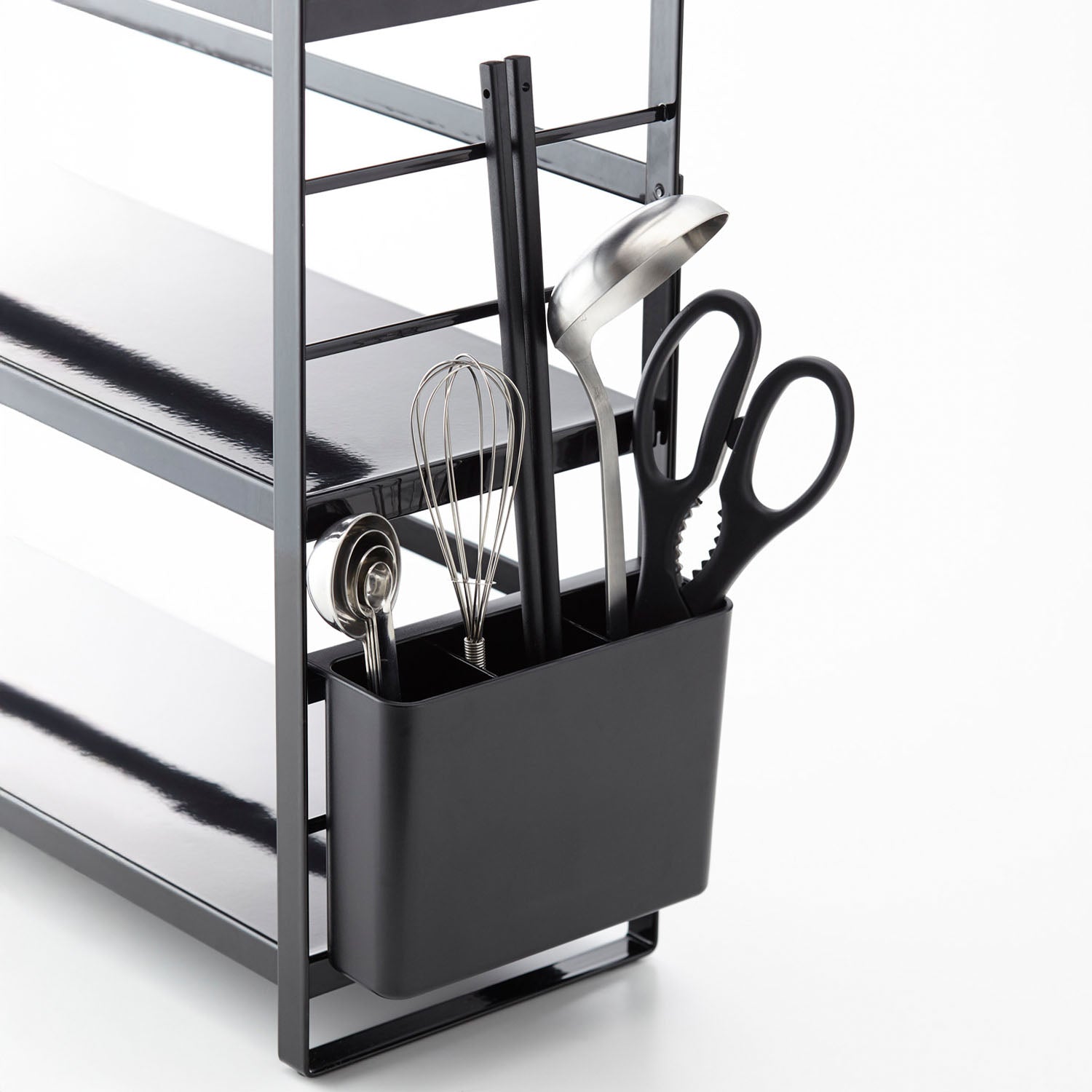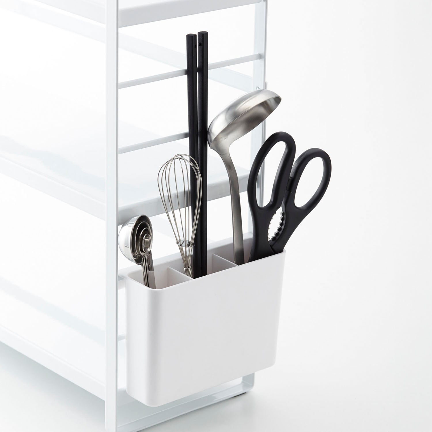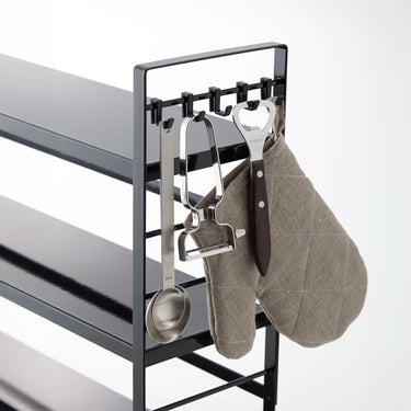 A shelf that utilises the dead space above your sink, gaps at the back or side of your stove, fitting perfectly in the space next to your stove. It can collectively store your condiments, spices, kitchen tools, and small items. The height of the shelves can be adjusted in 5cm intervals. It's also perfect for placing small pots. It comes with a cutlery pocket for quick access when needed and five hooks for hanging cooking utensils.