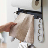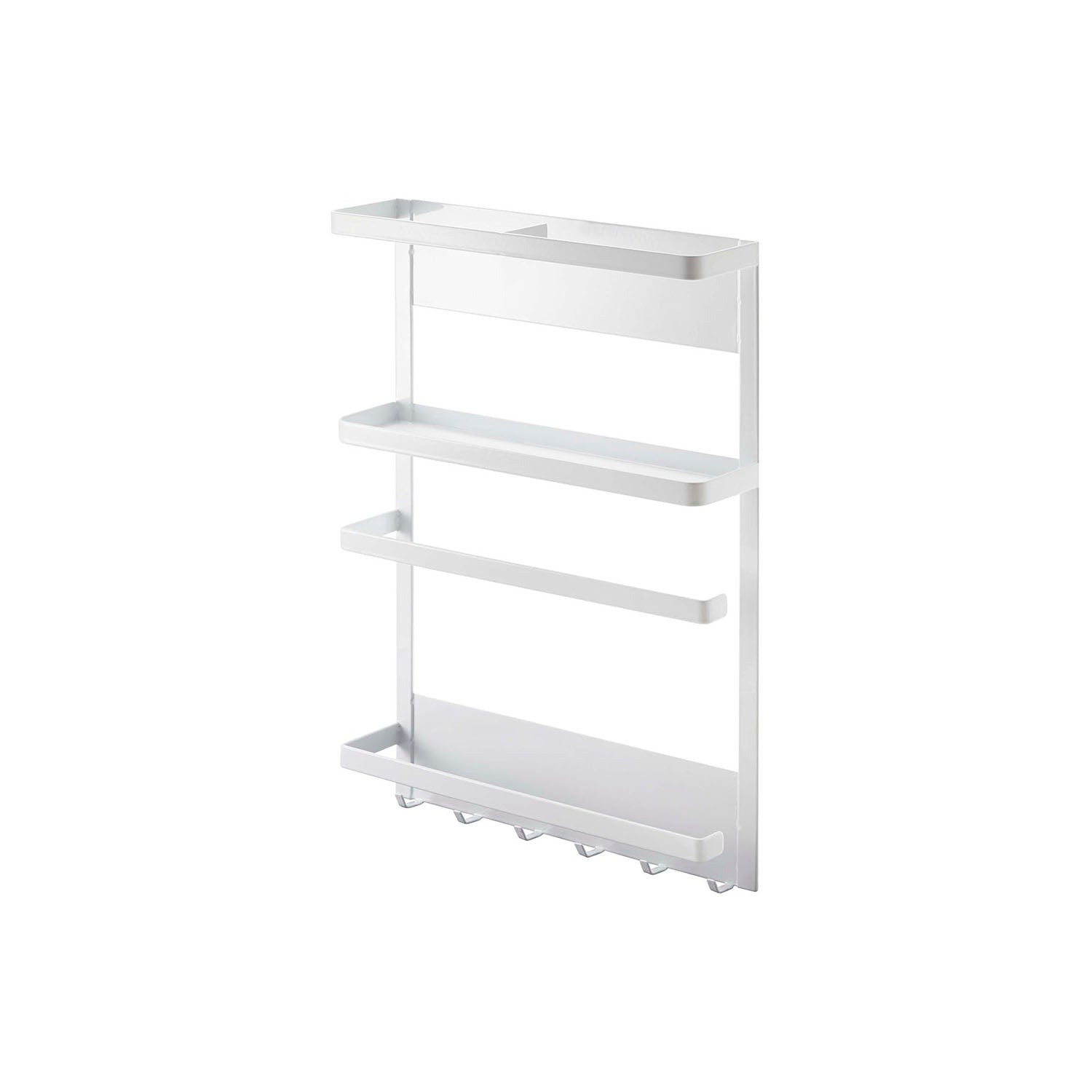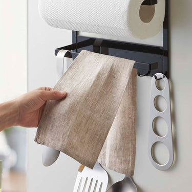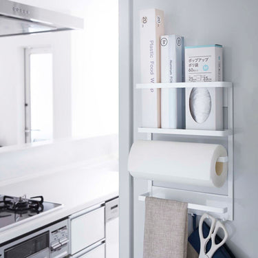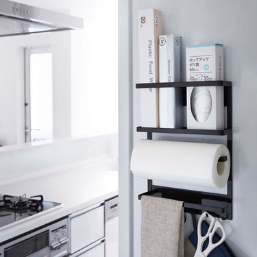 Easily attach to the side of your fridge with magnets for a one-stop storage solution for your frequently used kitchen items. The top section allows for upright storage of commonly used cling film or aluminium foil. The middle section features a holder for kitchen paper or dish cloths. The bottom section comes with hooks, providing a hanging storage solution for pot holders, bottle openers, can openers and more.