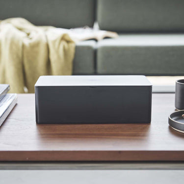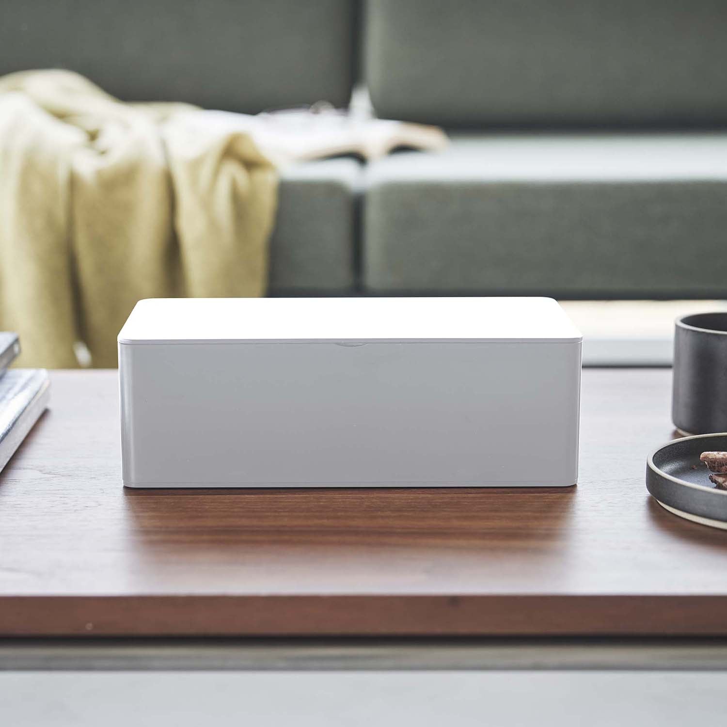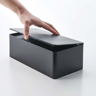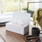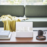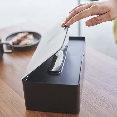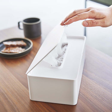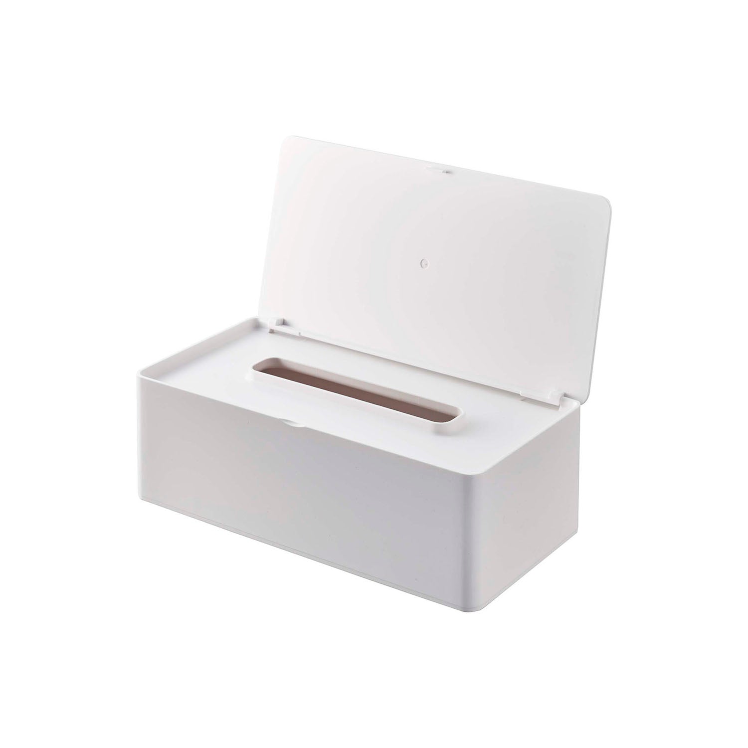 A tissue box cover with a lid that prevents mischief from small children and pets. It can accommodate standard tissue boxes up to about 7cm in height. The lid is designed to be difficult to open with the strength of a child or pet.