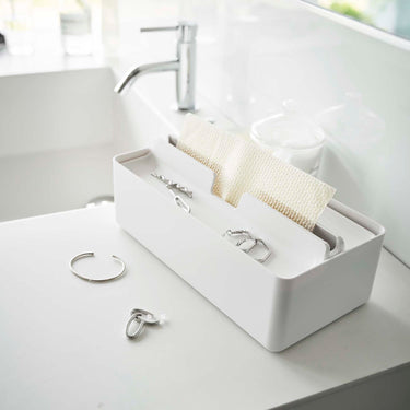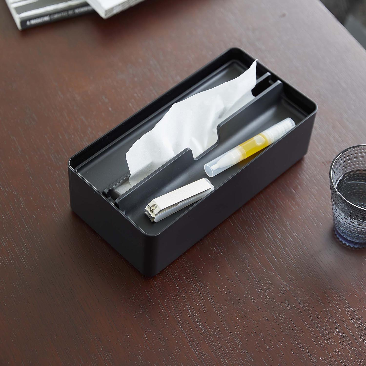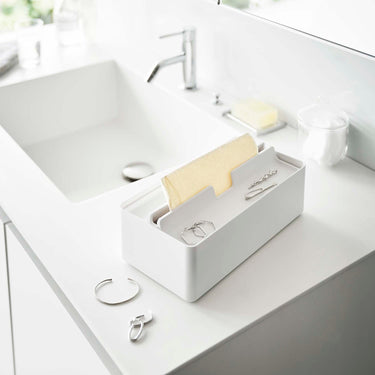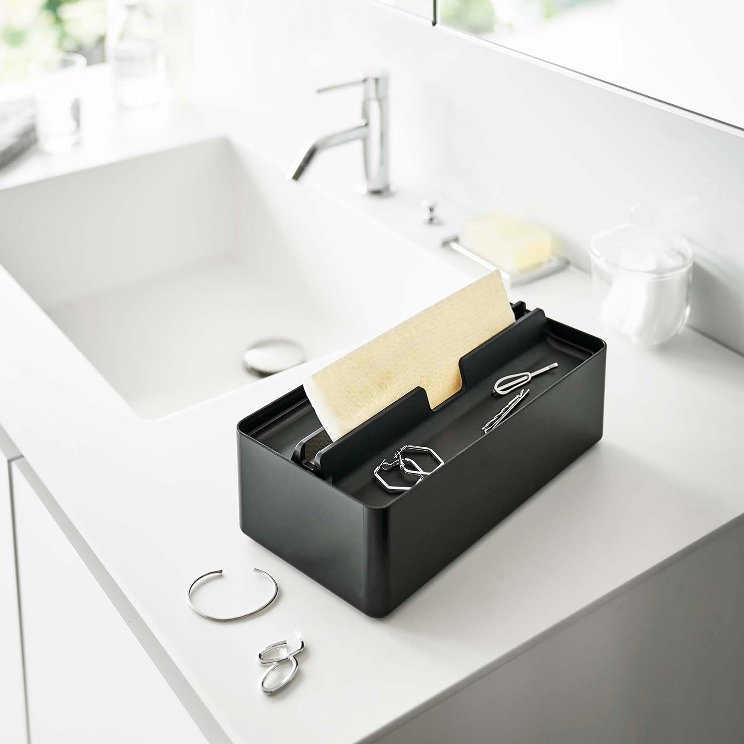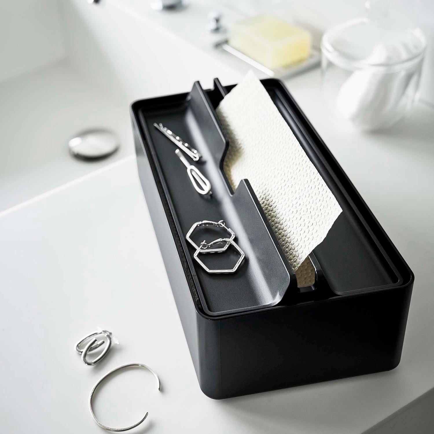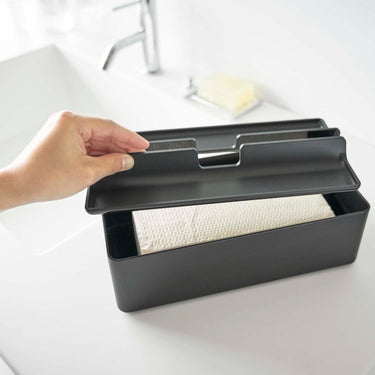 A handy paper towel case with a tray for temporary storage of accessories and small items.