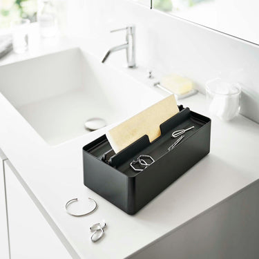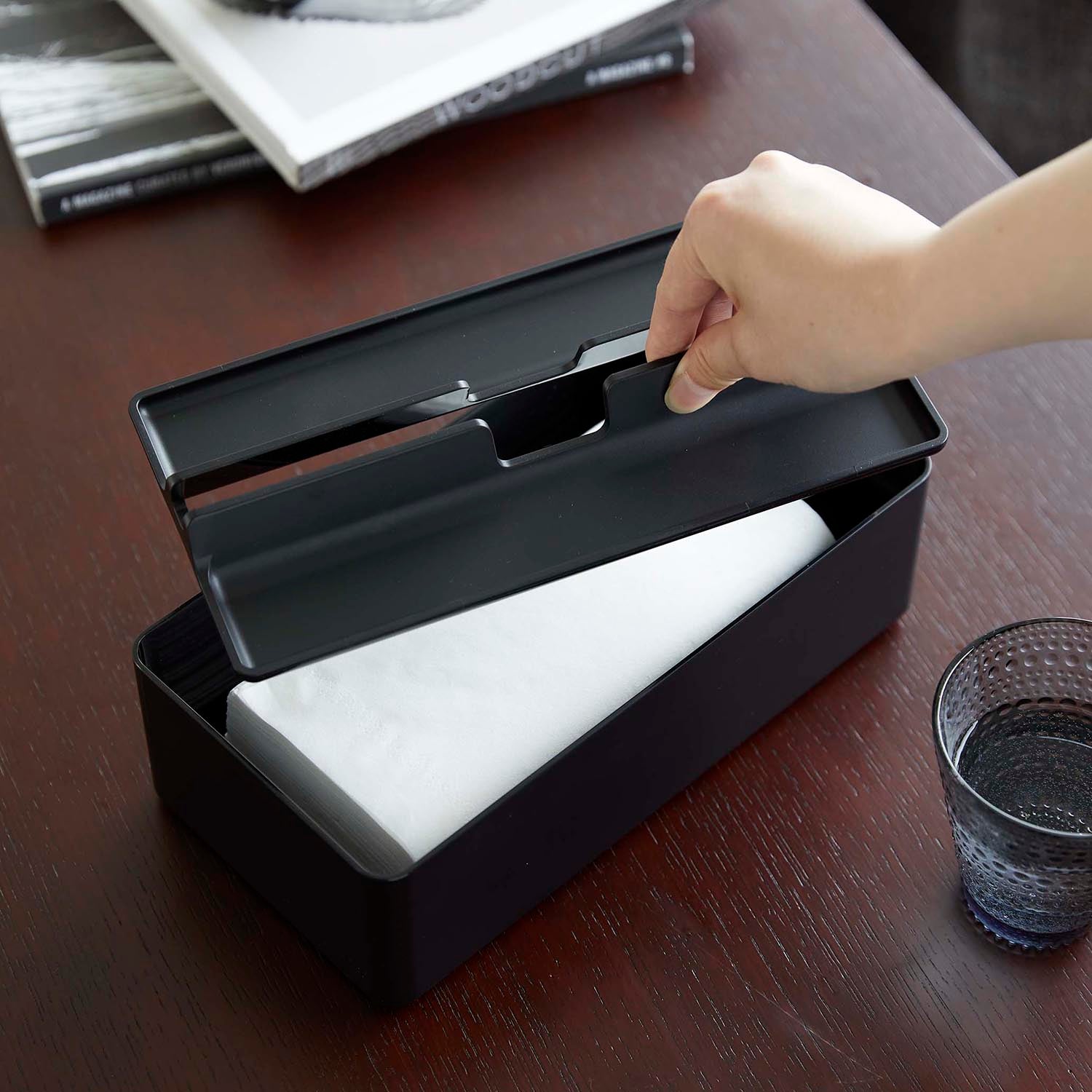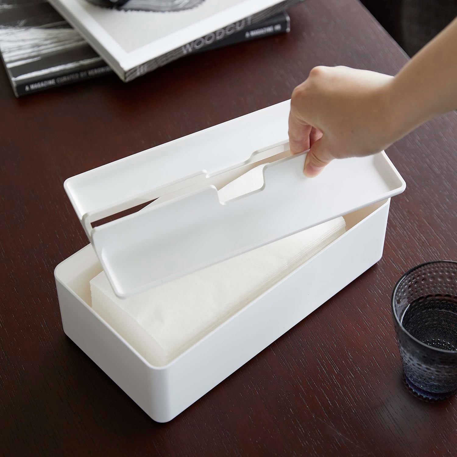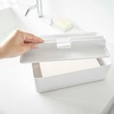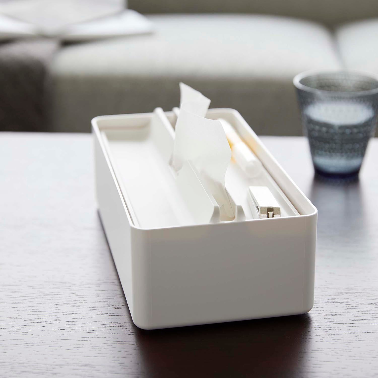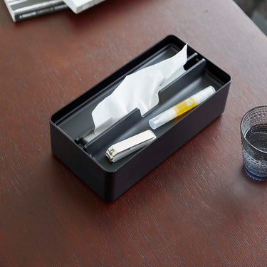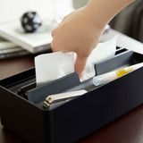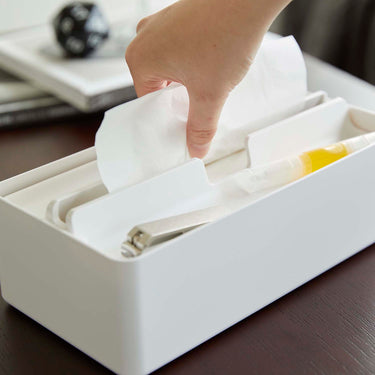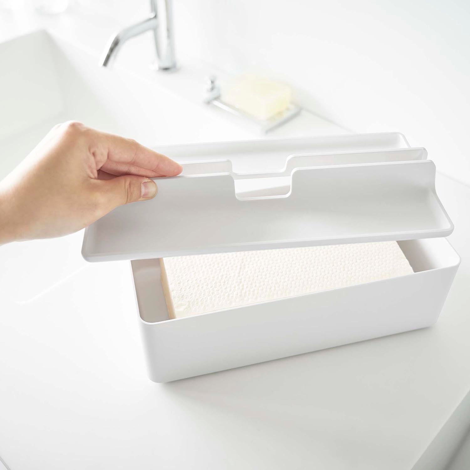 This case is compatible with both box-type and soft-pack tissues. The lid doubles as a tray, providing a handy storage space for accessories. Its design ensures smooth and easy tissue dispensing. Simply lift the lid for effortless replacement of the contents.