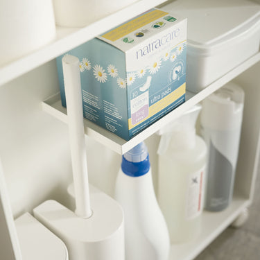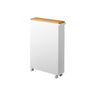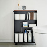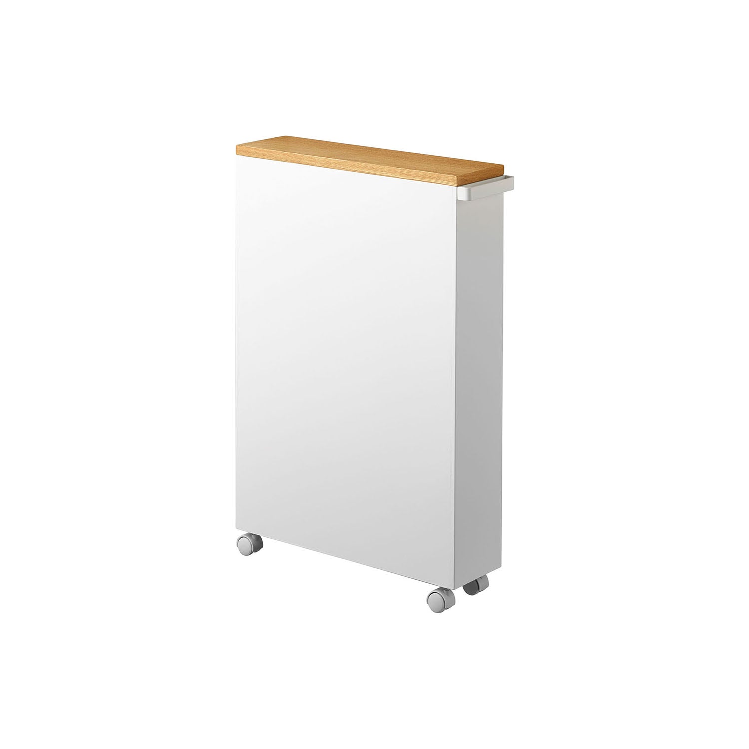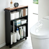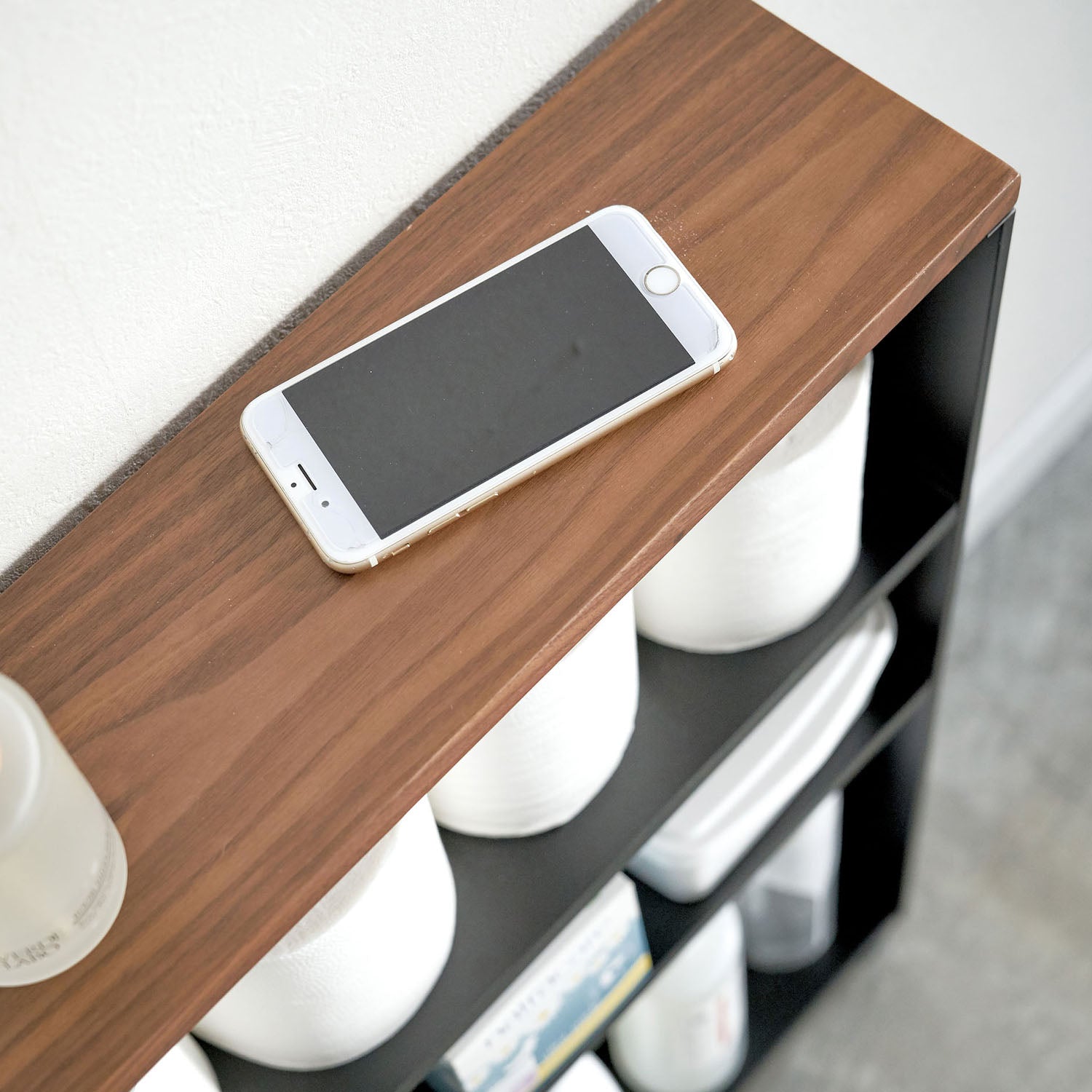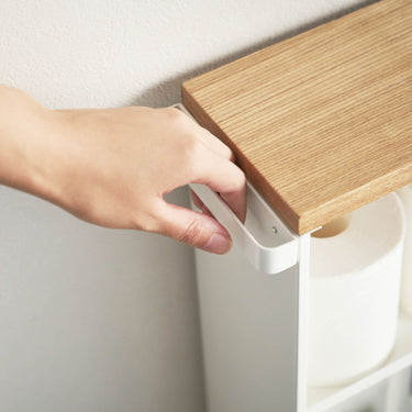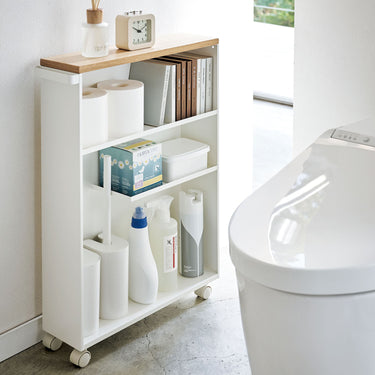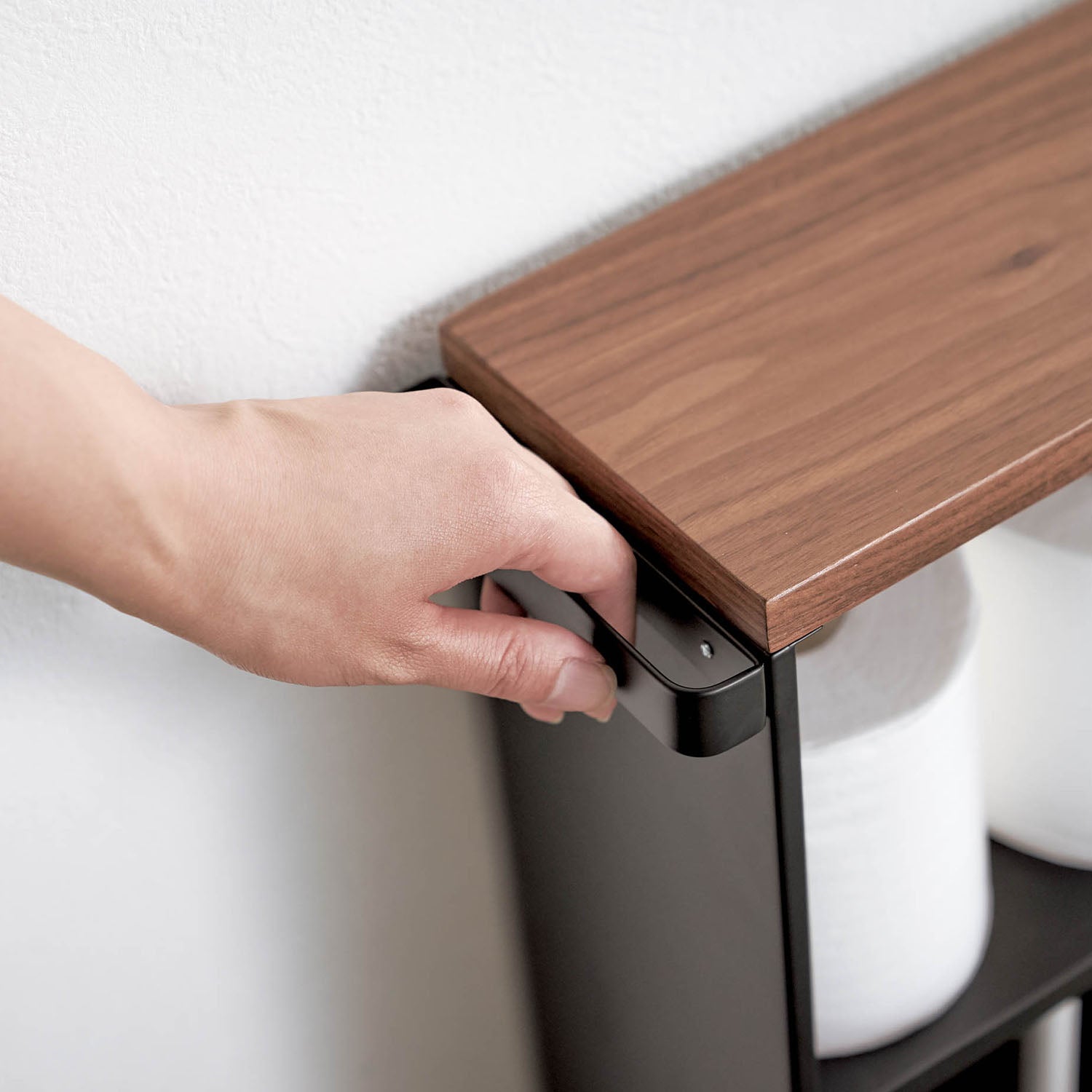 A slim rack that can create a neat and tidy space by hiding stored items. Equipped with casters and a handle, you can easily flip it over to conceal your items. It can store everything from toilet paper rolls, toilet cleaners, disinfectant wipes to paperback books all in one place. The handle can be attached to either the left or right side, depending on your preference.