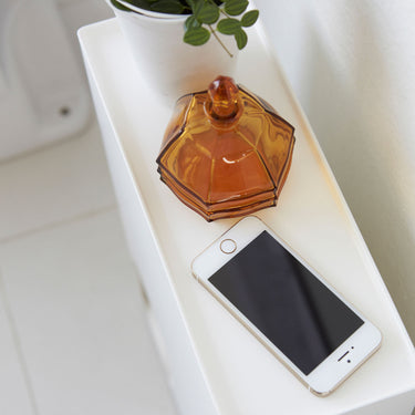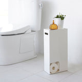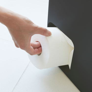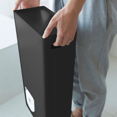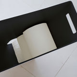 It features a convenient design where pulling out one roll brings the next one forward. When placed in a corner, it blends beautifully into the space without being too conspicuous. The openings are on both sides, so you won't have any trouble deciding which way to position it. The tray on the lid can hold items such as air fresheners, deodorising sprays, or even your smartphone. It also comes with a handle hole, making it easy to move and clean.