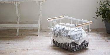 A Scandinavian-inspired line of storage essentials in warm white steel with wooden accents.