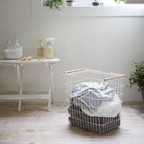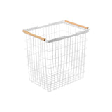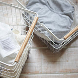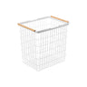 A beautiful laundry basket featuring a combination of neatly aligned steel wires and soft-featured wood.
