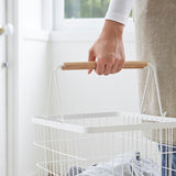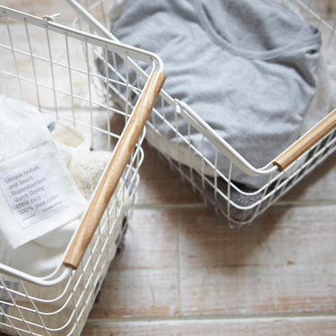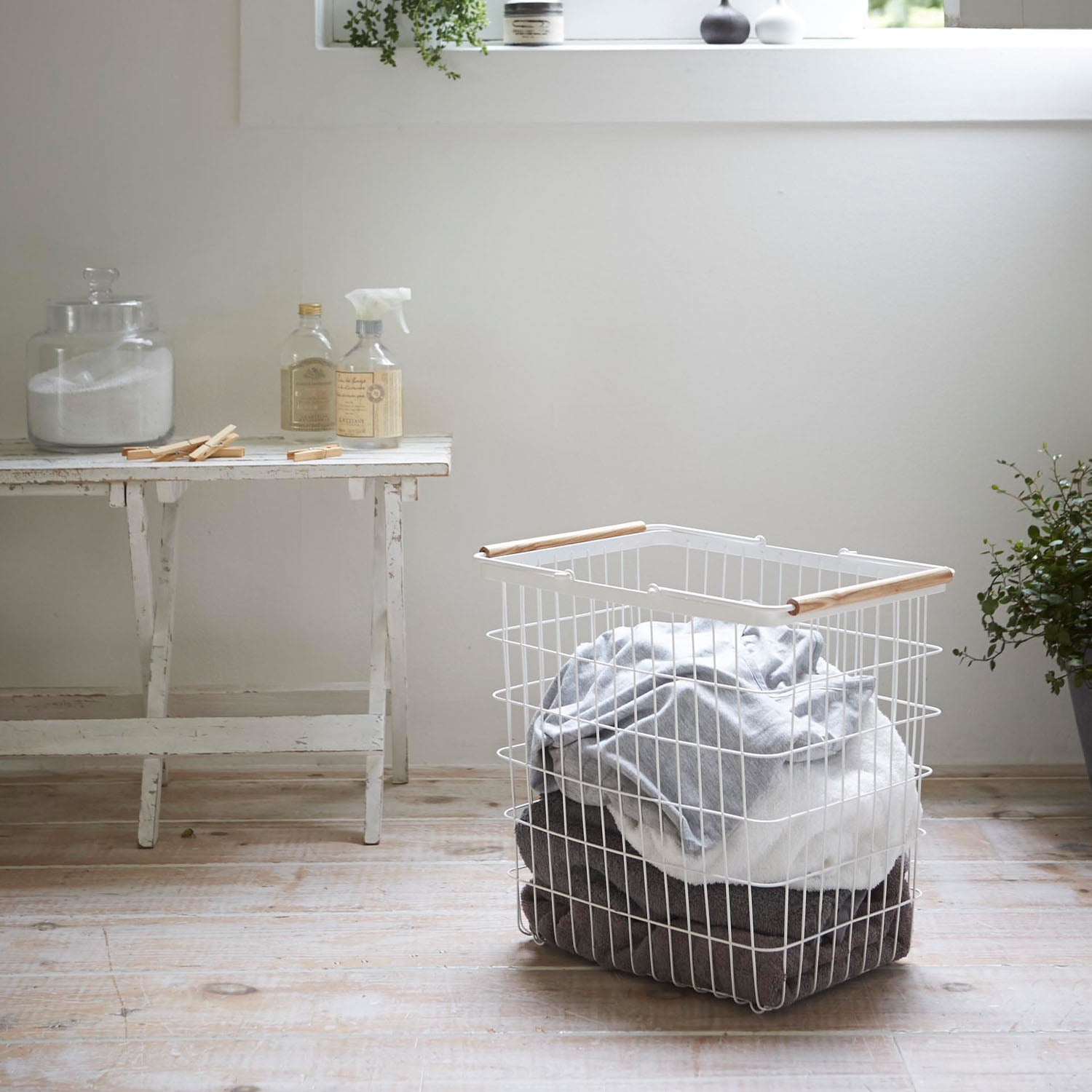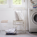 A laundry basket with a gentle ambiance, thanks to the combination of white and wood.