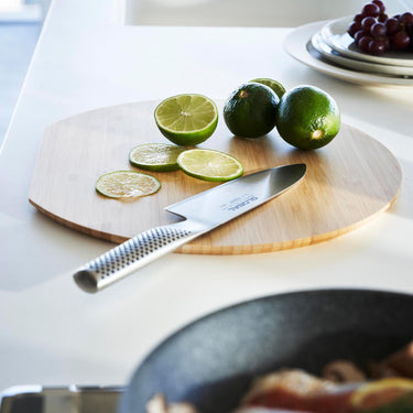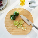 You can chop a variety of ingredients all at once while keeping the previously chopped ones on this spacious, round chopping board. The blade-friendly softness of the bamboo helps to prolong the life of your knives. You can also use it as a serving platter, presenting your freshly chopped ingredients directly at the table. The side cut design makes it easy to lift, and you can use both sides of the board.
