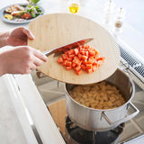 A spacious round chopping board with depth, allowing you to cut various ingredients all at once.
