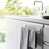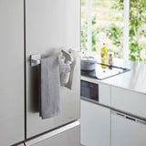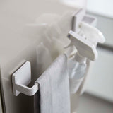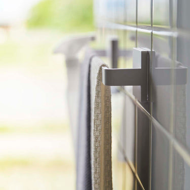 It can also be attached to the glass door of a fridge, making it handy for storing towels and sprays.