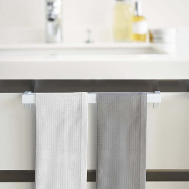 This simple and stylish towel rack can be installed on doors in the kitchen, bathroom, or toilet. The adjustable attachment hooks fit perfectly to the thickness of the door and are secured with screws, ensuring a sturdy, wobble-free installation. It can also be fitted to rail handle type doors.