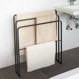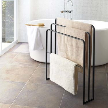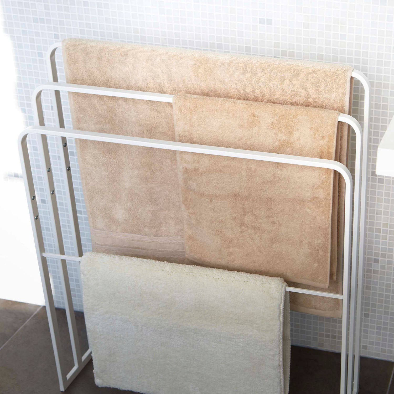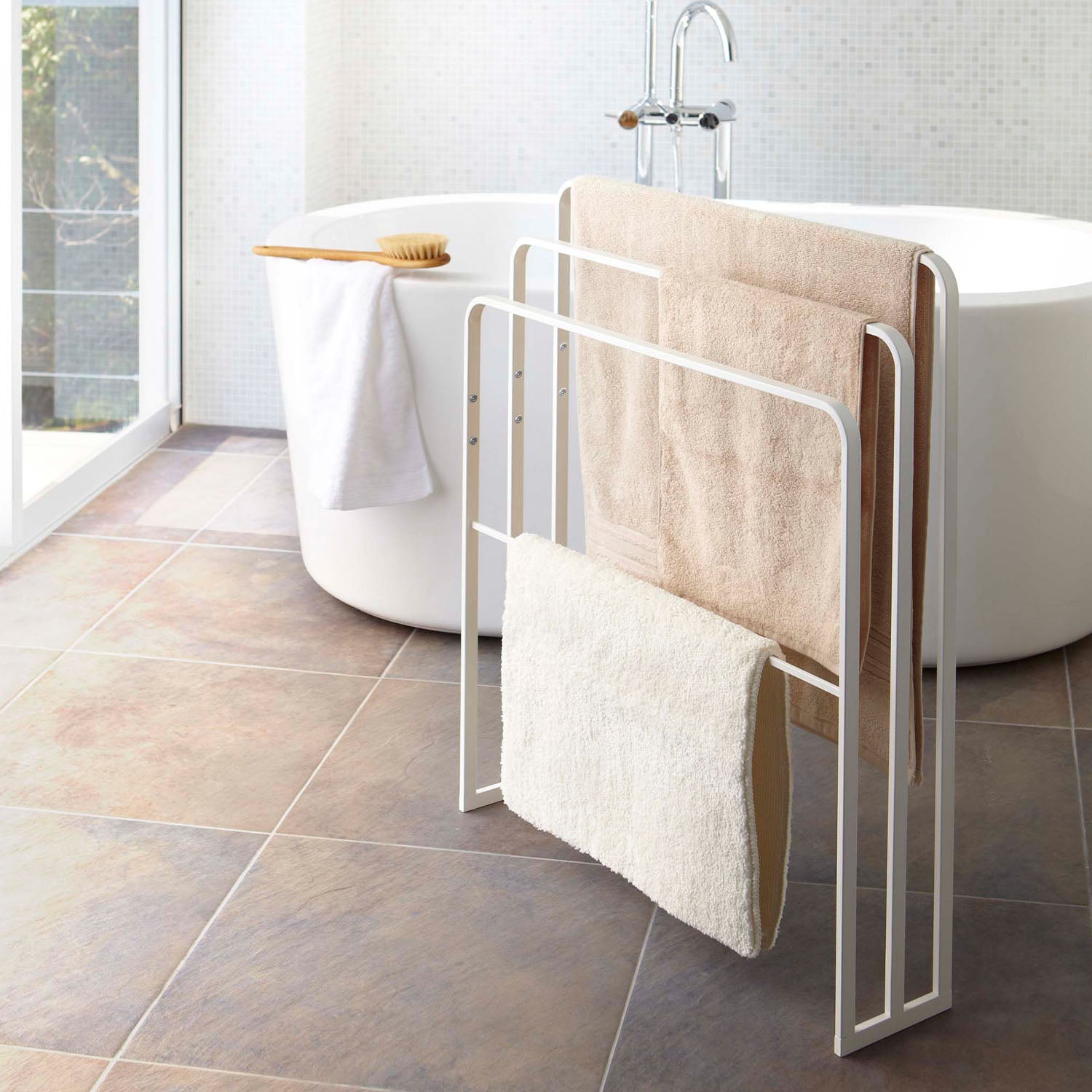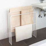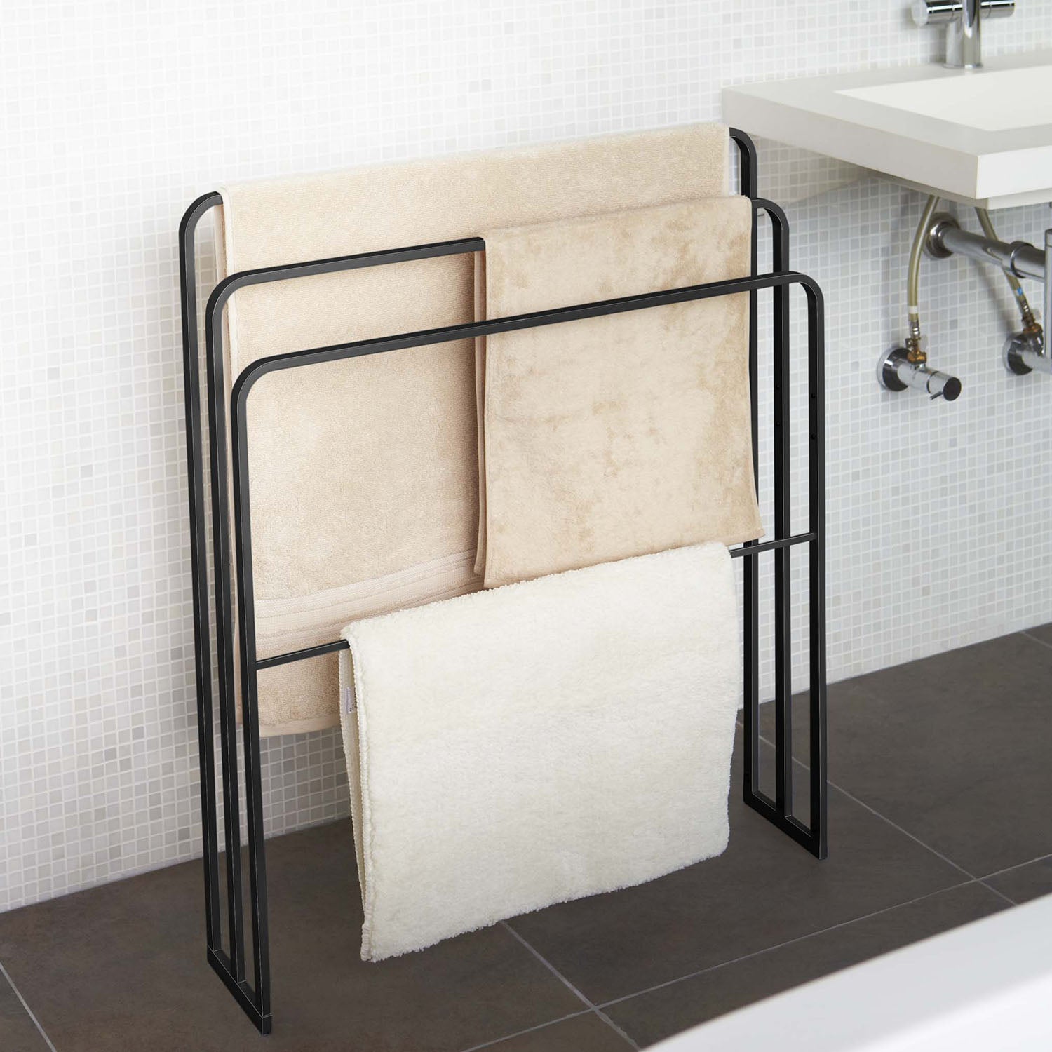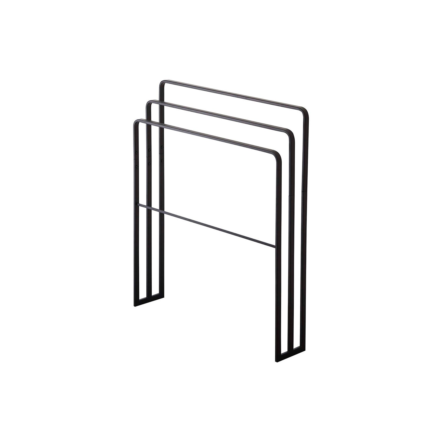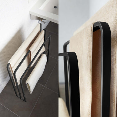 This is a wide-sized bath towel hanger that can accommodate large bath towels. With no frame on the side, you can easily hang your towel from the side. The lower bar can be used to hang items such as bath mats.