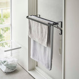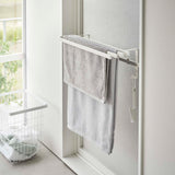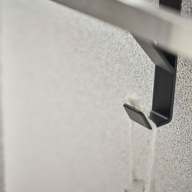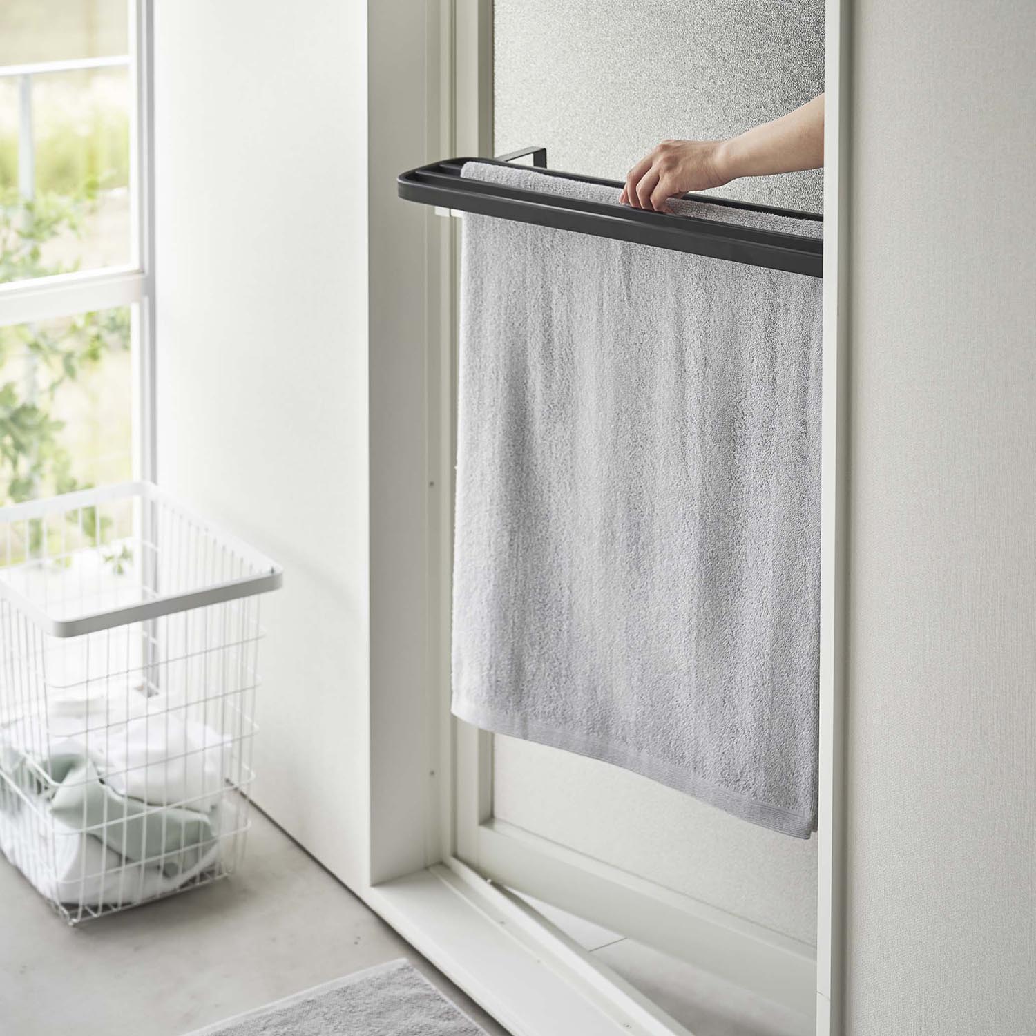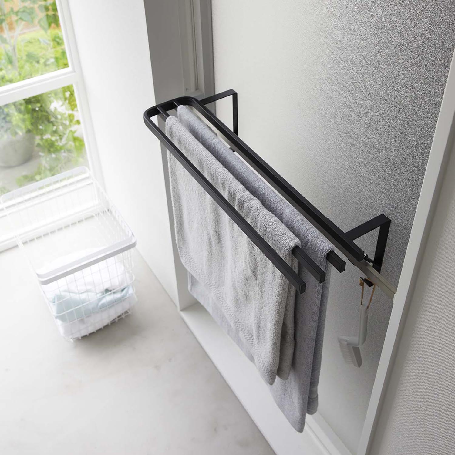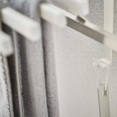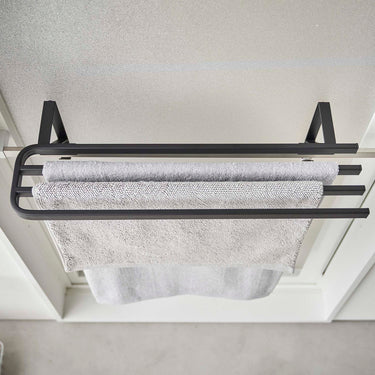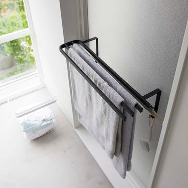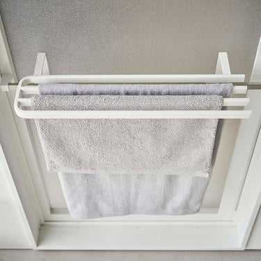 Simply place it on the towel bar of your bathroom door. A hanger that increases your bath towel storage.