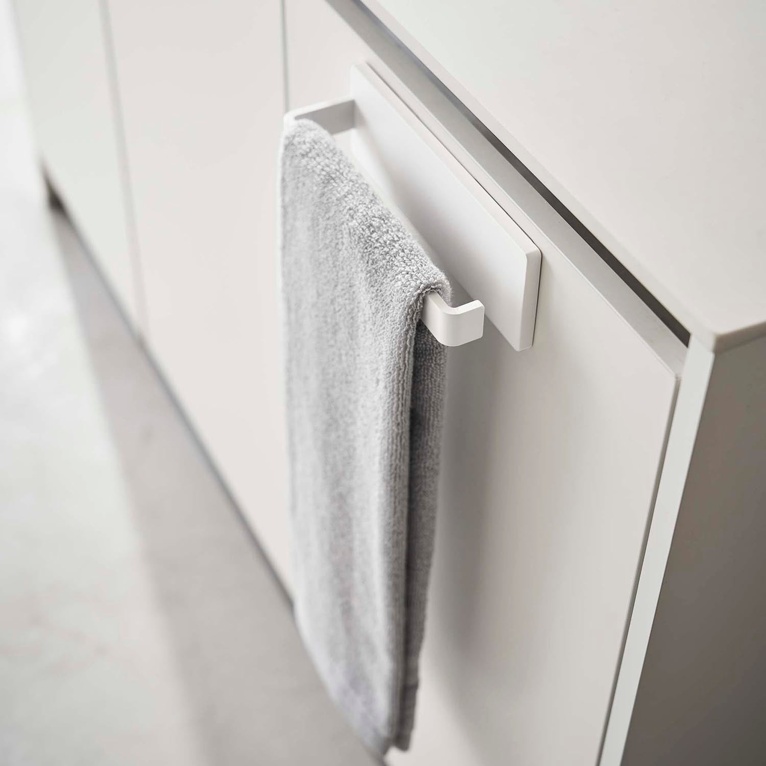 This is an 18cm wide towel hanger that can be easily attached to glossy doors, drawers, and walls using film hooks. It can also be attached to kitchen panels and tiles. Towels can be quickly and easily hung from the side. You can choose the direction of installation to suit your preference. It also comes in handy for storing cleaning tools such as sprays.