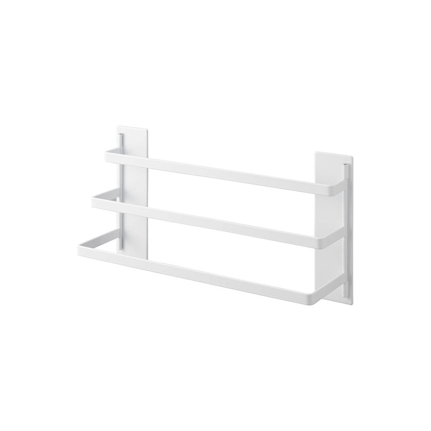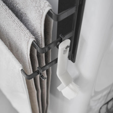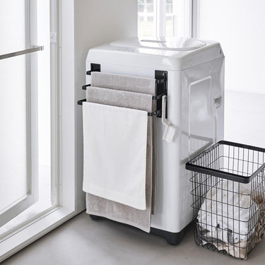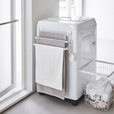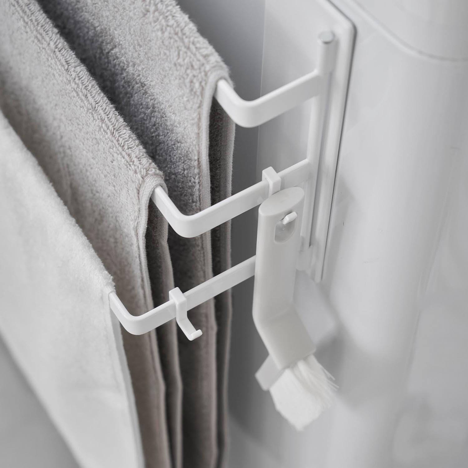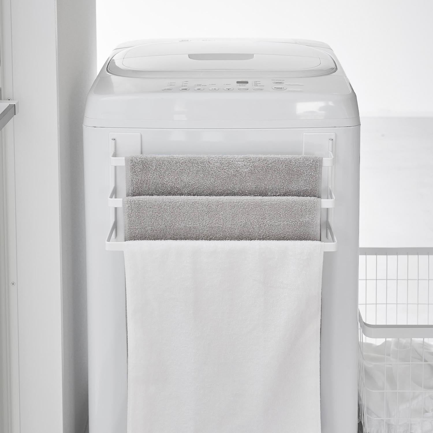 This easy-to-install triple towel hanger uses magnets, allowing you to place it at your preferred height in front of the washing machine. It's convenient for temporarily hanging towels after a bath. The magnetic part has a hinge structure, enabling it to fit the curved surface of the washing machine. The ladder shape ensures towels don't overlap, making them easy to dry and remove. The included hooks allow you to hang small items around the washing machine.
