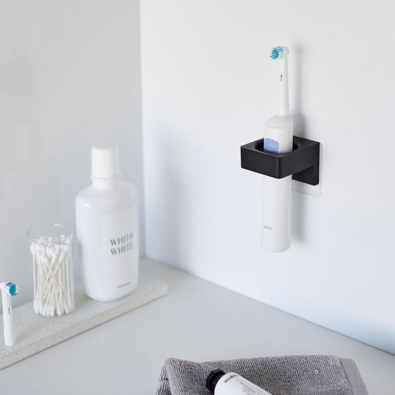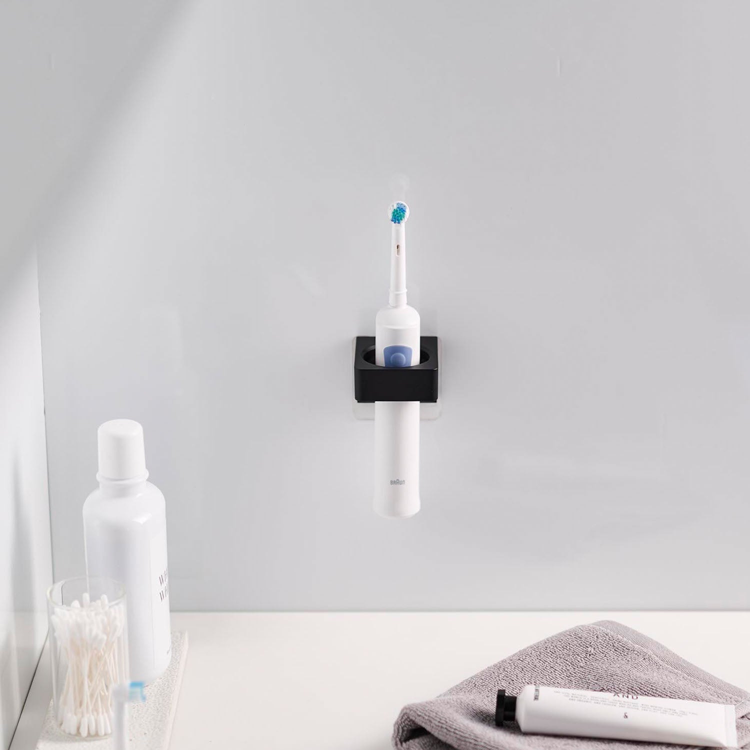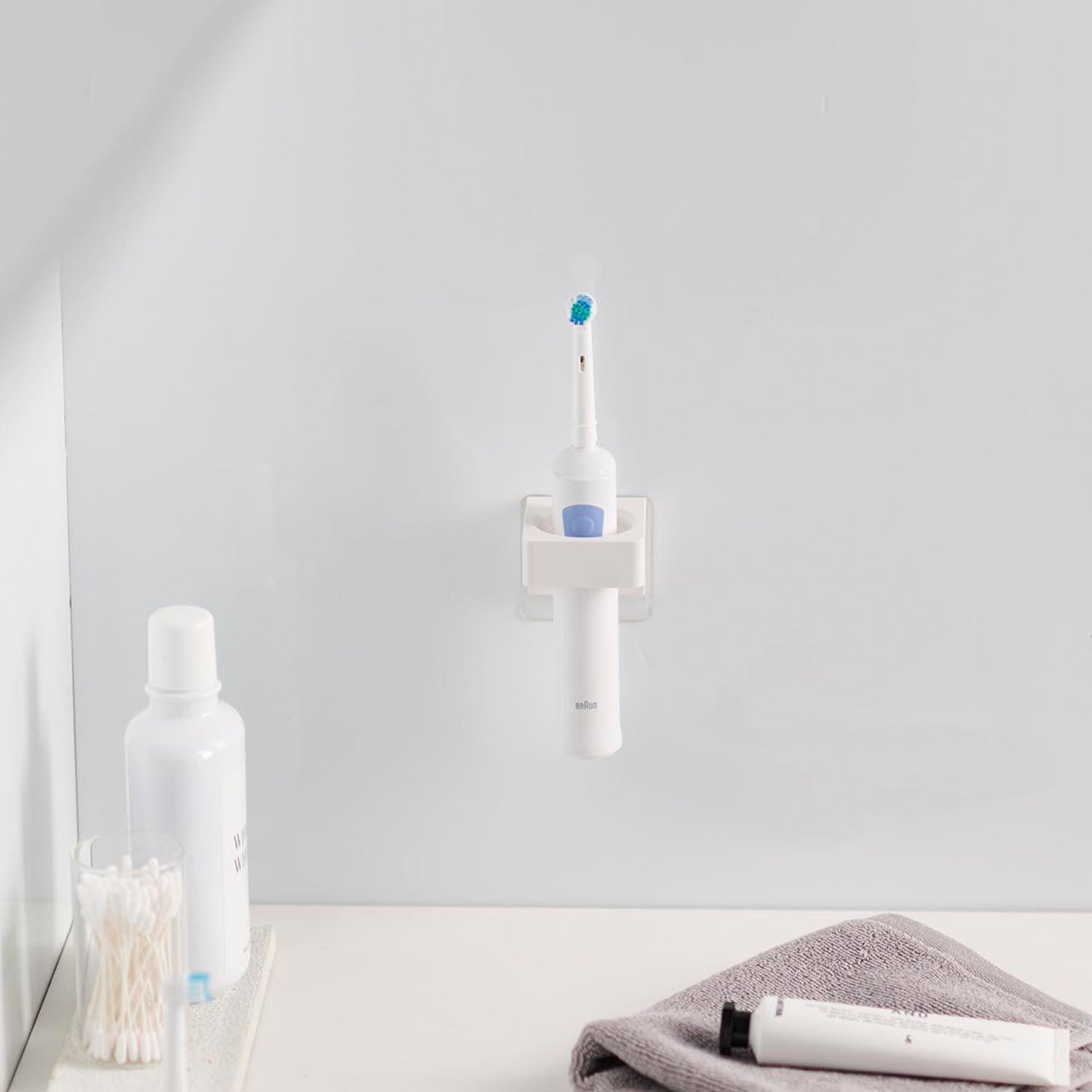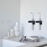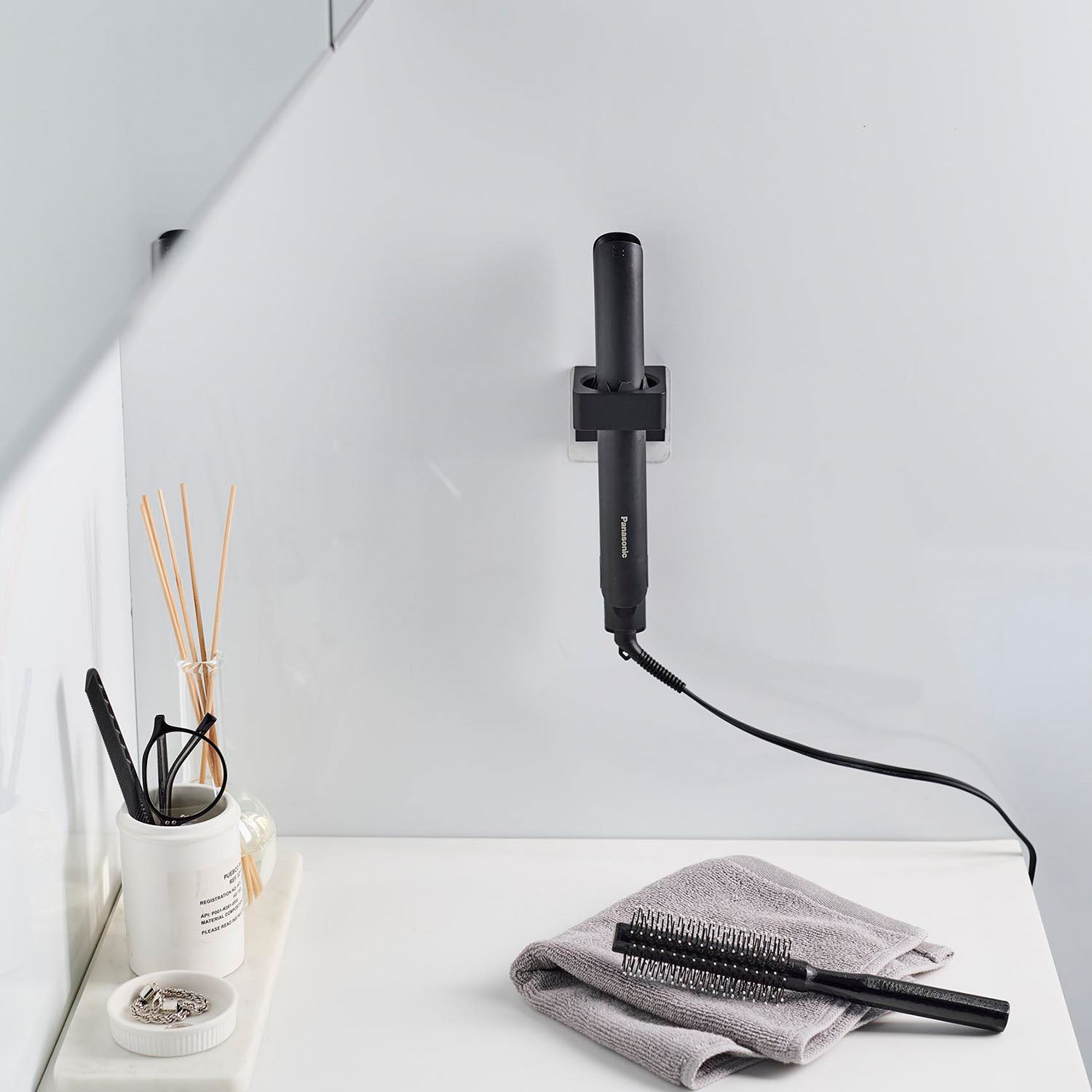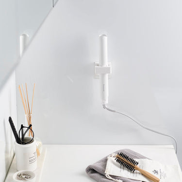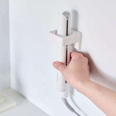 This holder allows you to store items such as bath towels, towels, electric toothbrushes, and hair irons on the wall. It can accommodate items with a diameter of 2.5cm to 3.5cm. It's also handy to use two for differentiating between electric toothbrushes. You can insert items from either the top or bottom, depending on your preference. Installation is easy, simply stick the film hook on the wall and hang the main body.