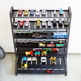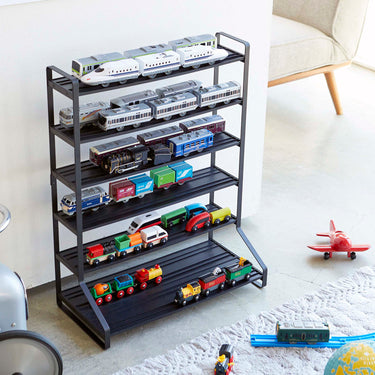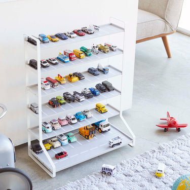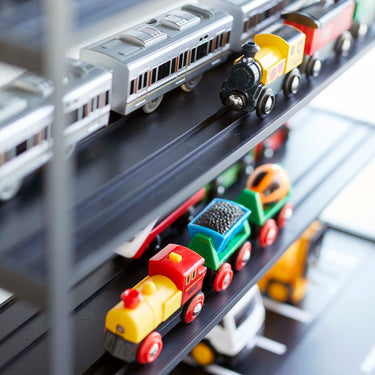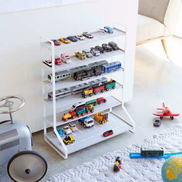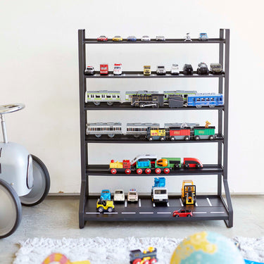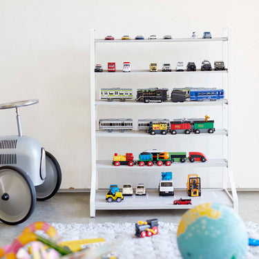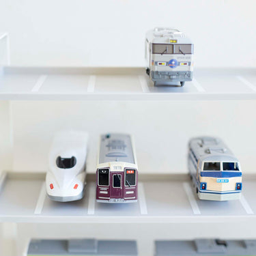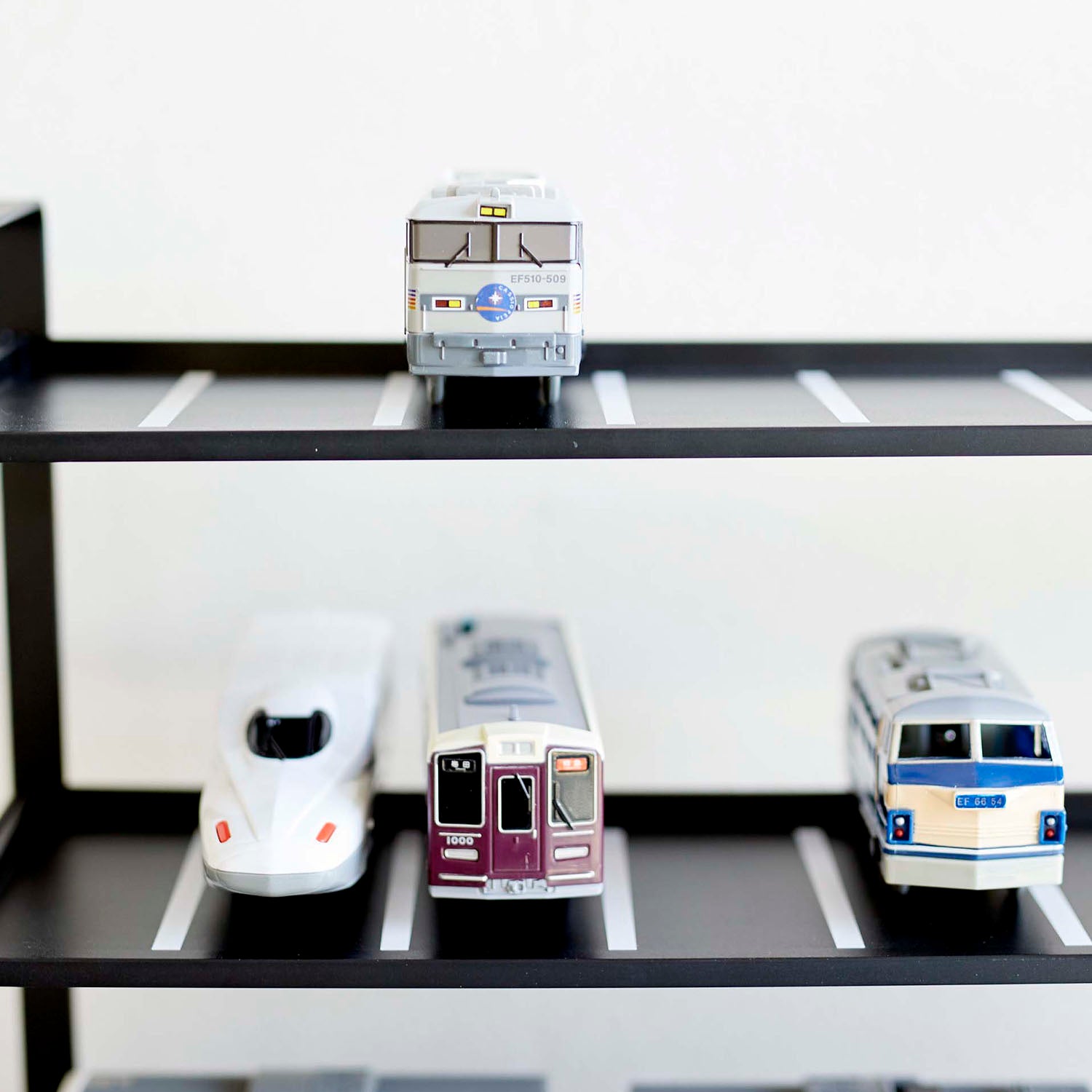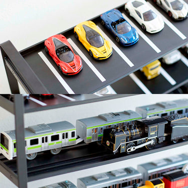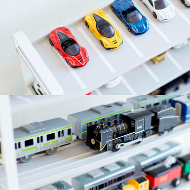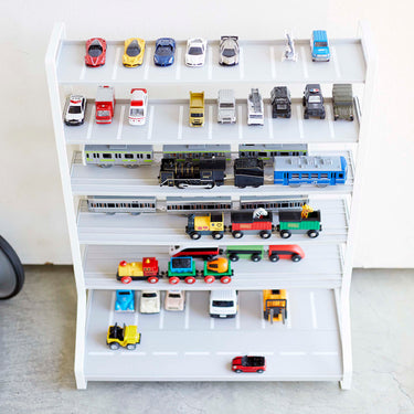 The tray is double-sided, designed for both mini cars and rail toys. This rack enables you and your child to have fun displaying toys while keeping them tidy. As the tray can be used on both sides, you can set it up according to the amount of toys you have. It can also be used exclusively for mini cars or rail toys.