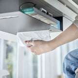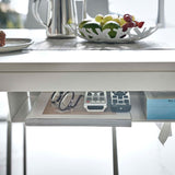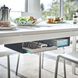 Securely fixed to the underside of the table with wood screws. This allows for all your commonly scattered items such as remote controls and tissues to be neatly stored away, leaving your table clear and spacious. It's also great for remote working. Conveniently, tissues can be pulled out from the bottom of the product.