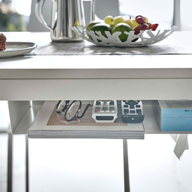 Store all your commonly scattered items like remotes and tissues under the table in one go.