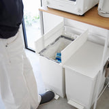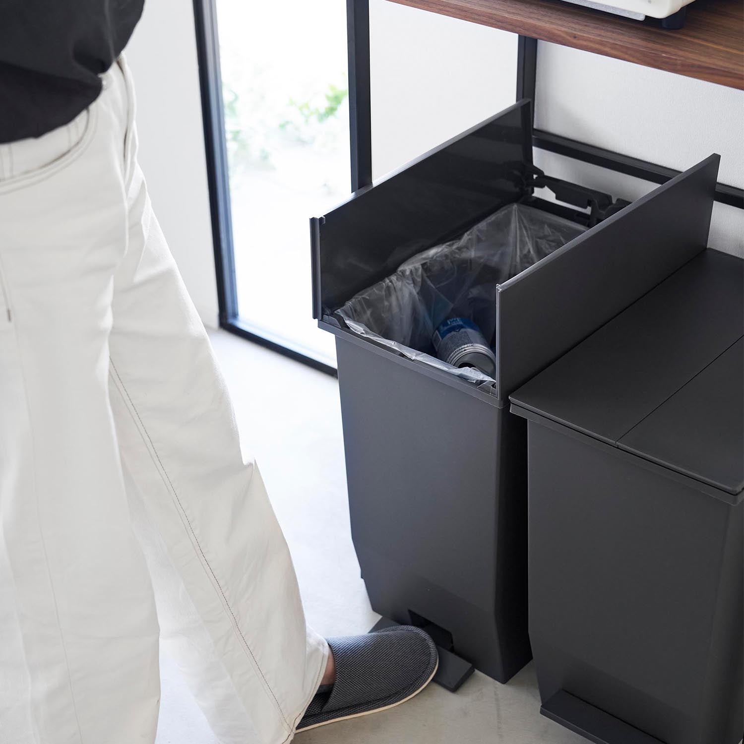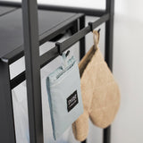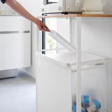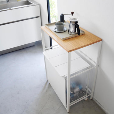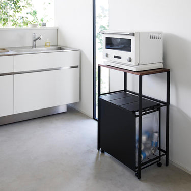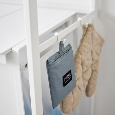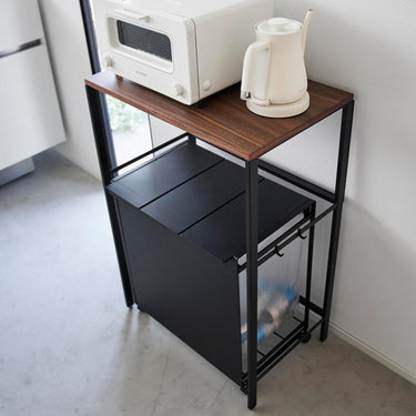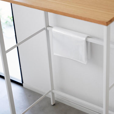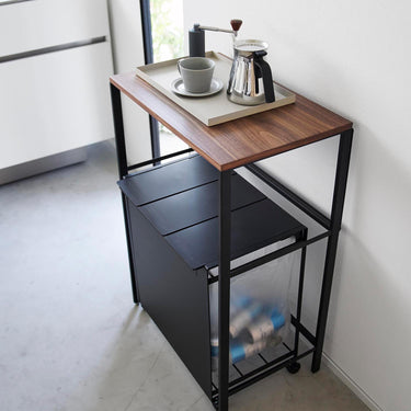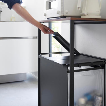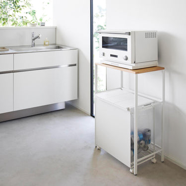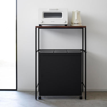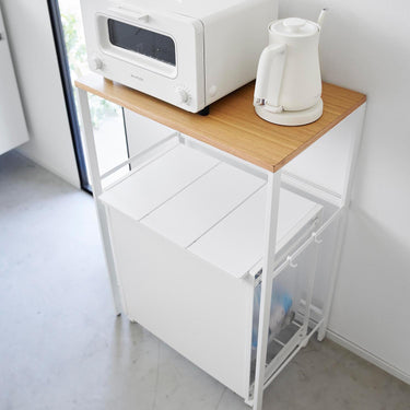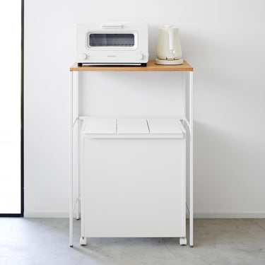 Make efficient use of the space above your bin! This rack neatly fits over lidded bins and pedal-operated bins that open from both sides. With a height of 83cm from the floor to the top, it provides a handy space for placing household appliances such as microwaves, toasters, and electric kettles. The separately sold 'Covered Privacy Sorting Dust Wagon Tower 3 Sorting' (Product numbers 5977/5978) fits neatly underneath, and even when the lid is fully open, it doesn't hit the top. Replacement bin bags and the like can be conveniently hung on the bar. The wood grain of the top blends in with your interior. The included hooks can be used to hang small kitchen items.