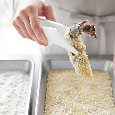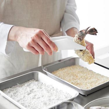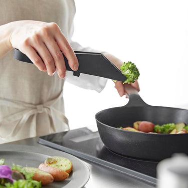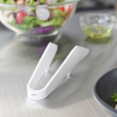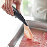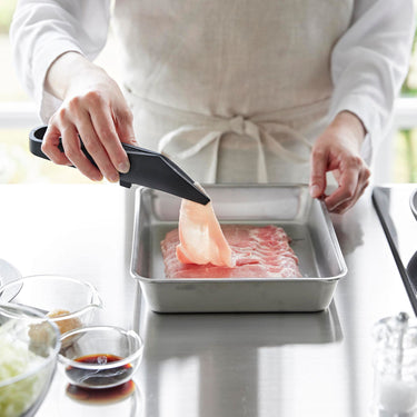 This is a slightly smaller-sized tong made of silicone, which is slip-resistant and heat-resistant. It's coated with silicone, so you can use it safely without scratching your frying pans or pots. The grip is thick for easy handling, and the thin tip allows you to firmly pick up even thin slices of meat one by one. The tip is designed to hover when placed down, keeping it clean and off the surface. It's also dishwasher safe.