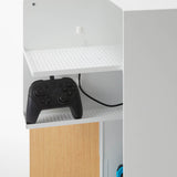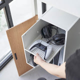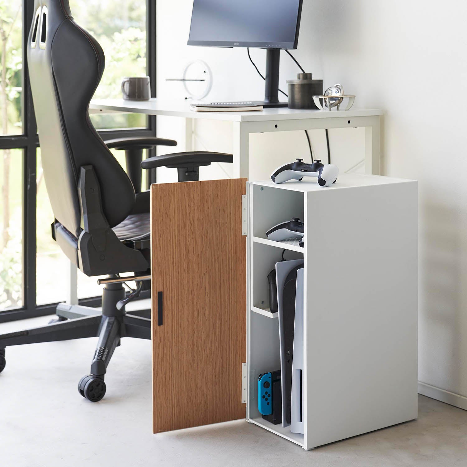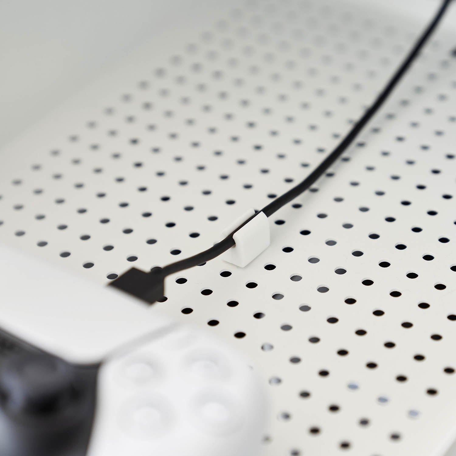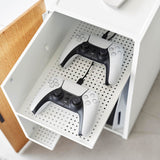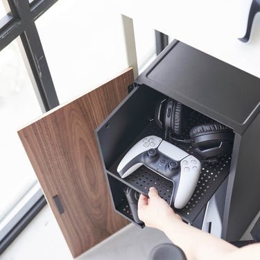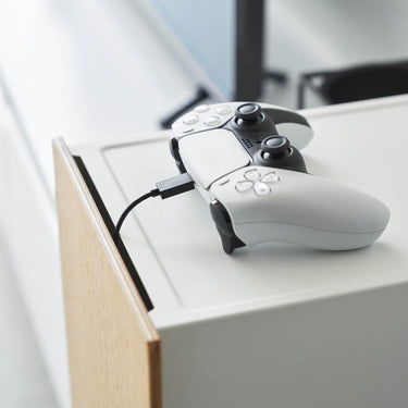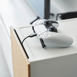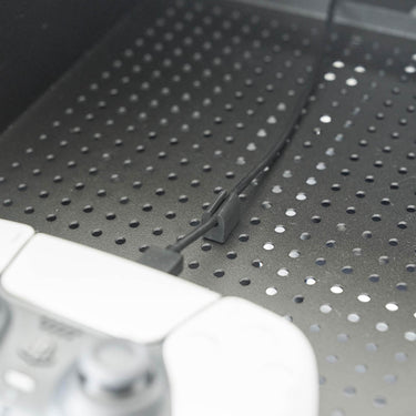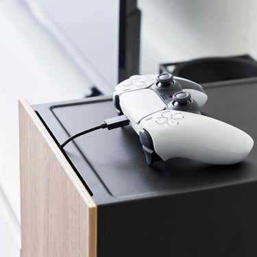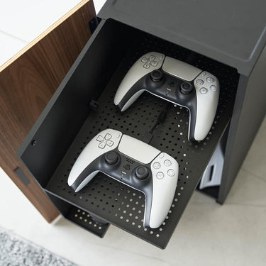This spacious rack allows you to neatly store and hide game consoles and controllers that can often clutter up living spaces. The shelves are pull-out style, making it easy to retrieve items placed at the back. The top shelf is spacious enough to comfortably fit two controllers side by side. It also comes with a silicone cable holder. There is a slit between the lid and the rack, allowing you to temporarily place your controller on the top while charging. The back is filled with ventilation holes, ensuring smooth insertion and removal of cables.