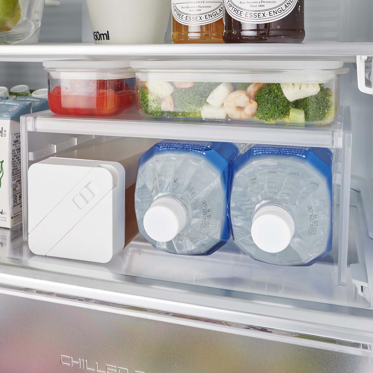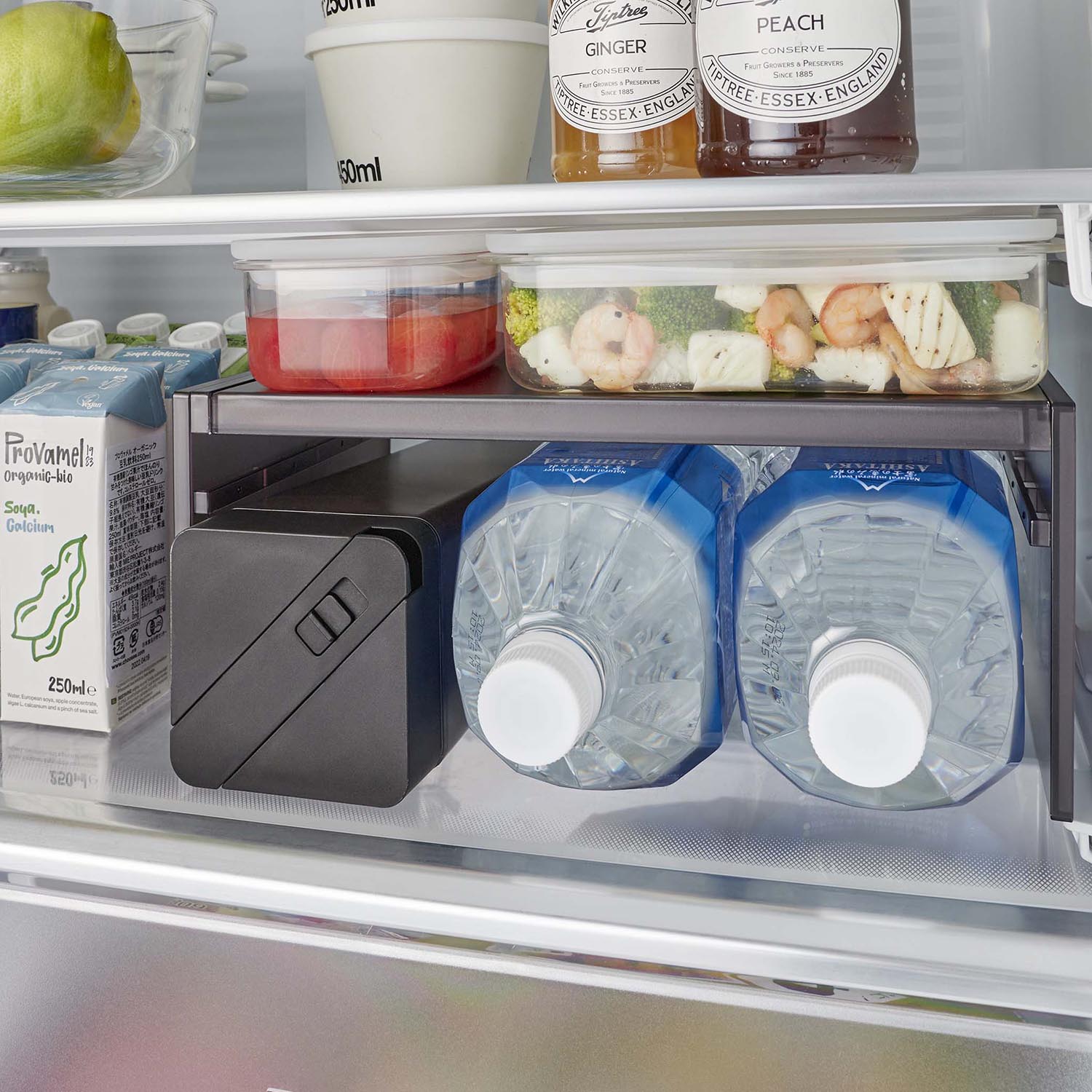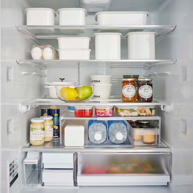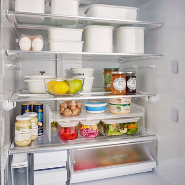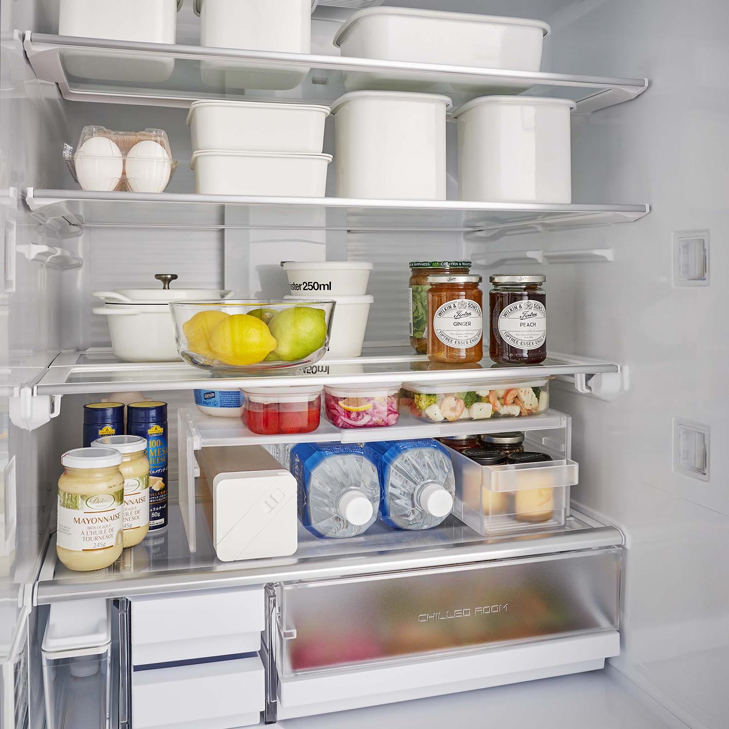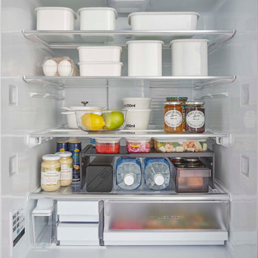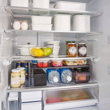 The shelf height can be adjusted in two stages, allowing you to choose the height that best suits your storage needs. It can also accommodate 2L bottles or cold water flasks underneath. Assembly is a breeze - simply slot it in. You can store your prepared Tupperware in the space above without stacking them directly on top of each other.